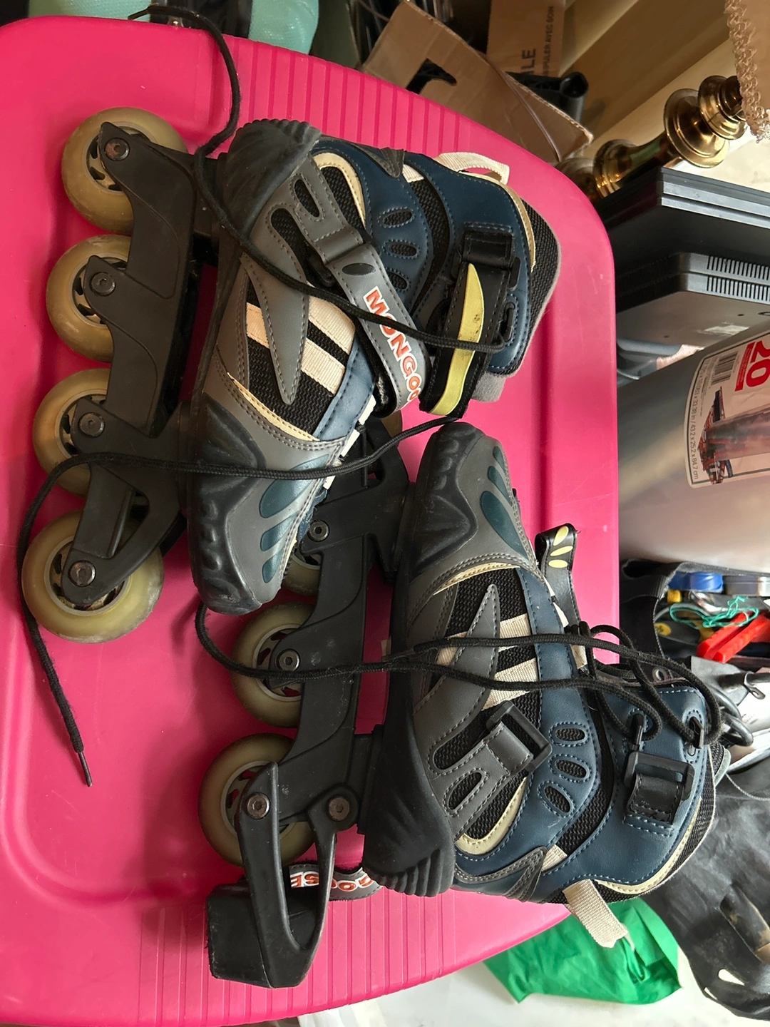 734Pair of used inline roller blades Blue, grey, and white colour scheme.