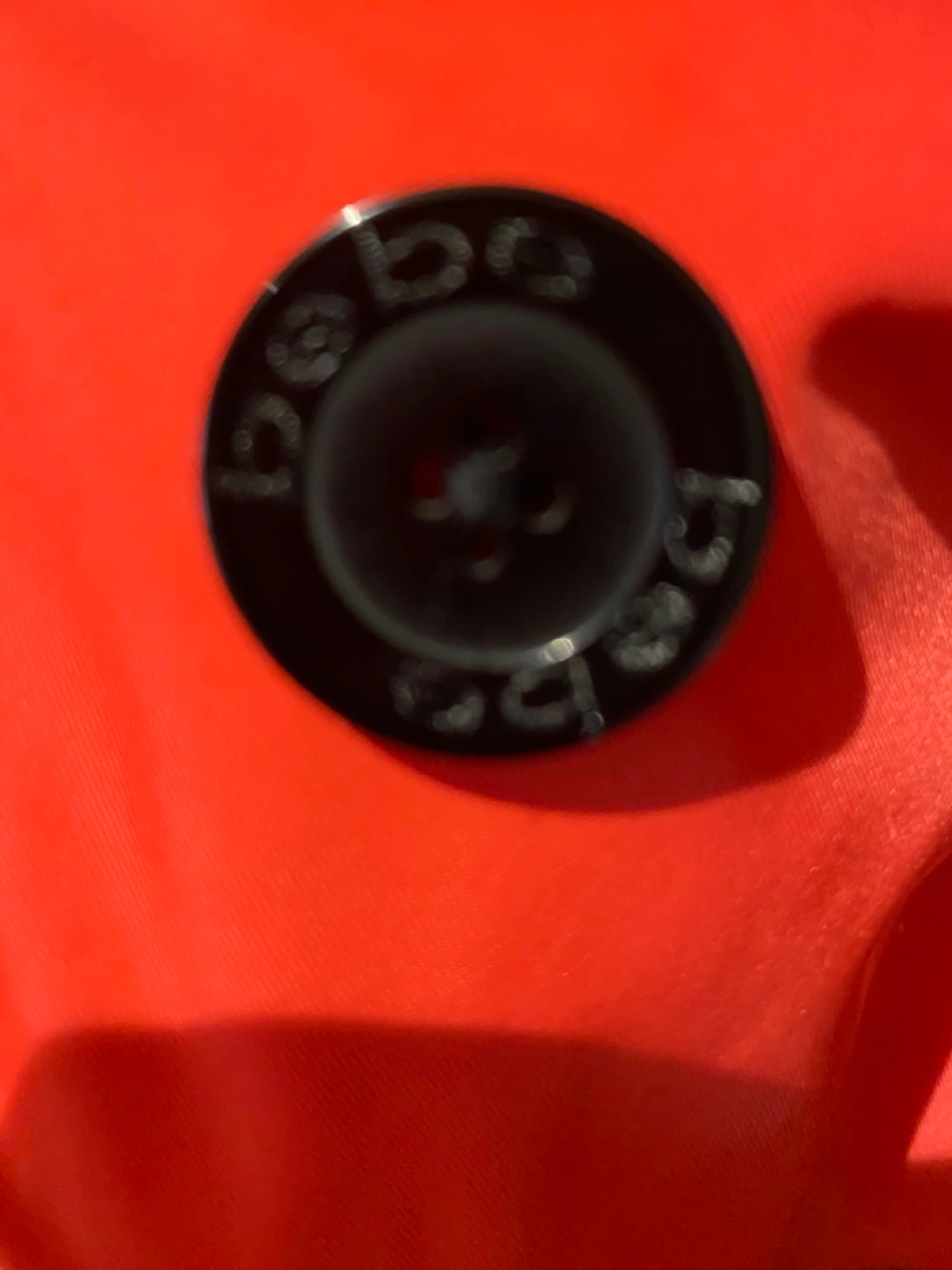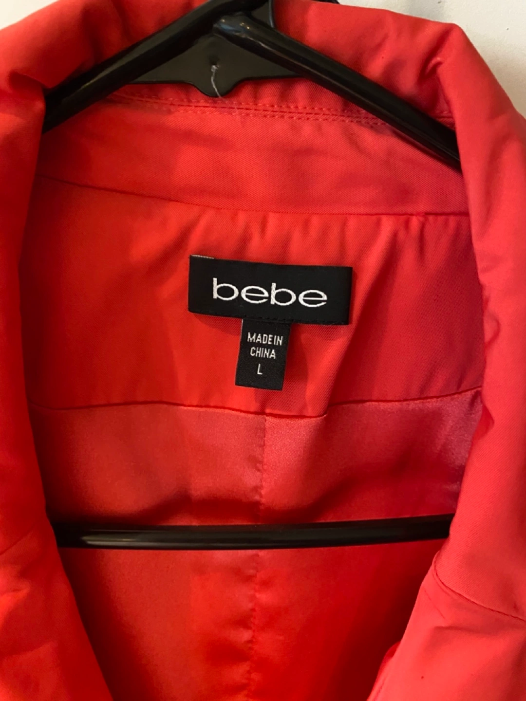 Stylish red trench coat. Double-breasted design. Features a belt. Long sleeves. Size Large/ fits like a M