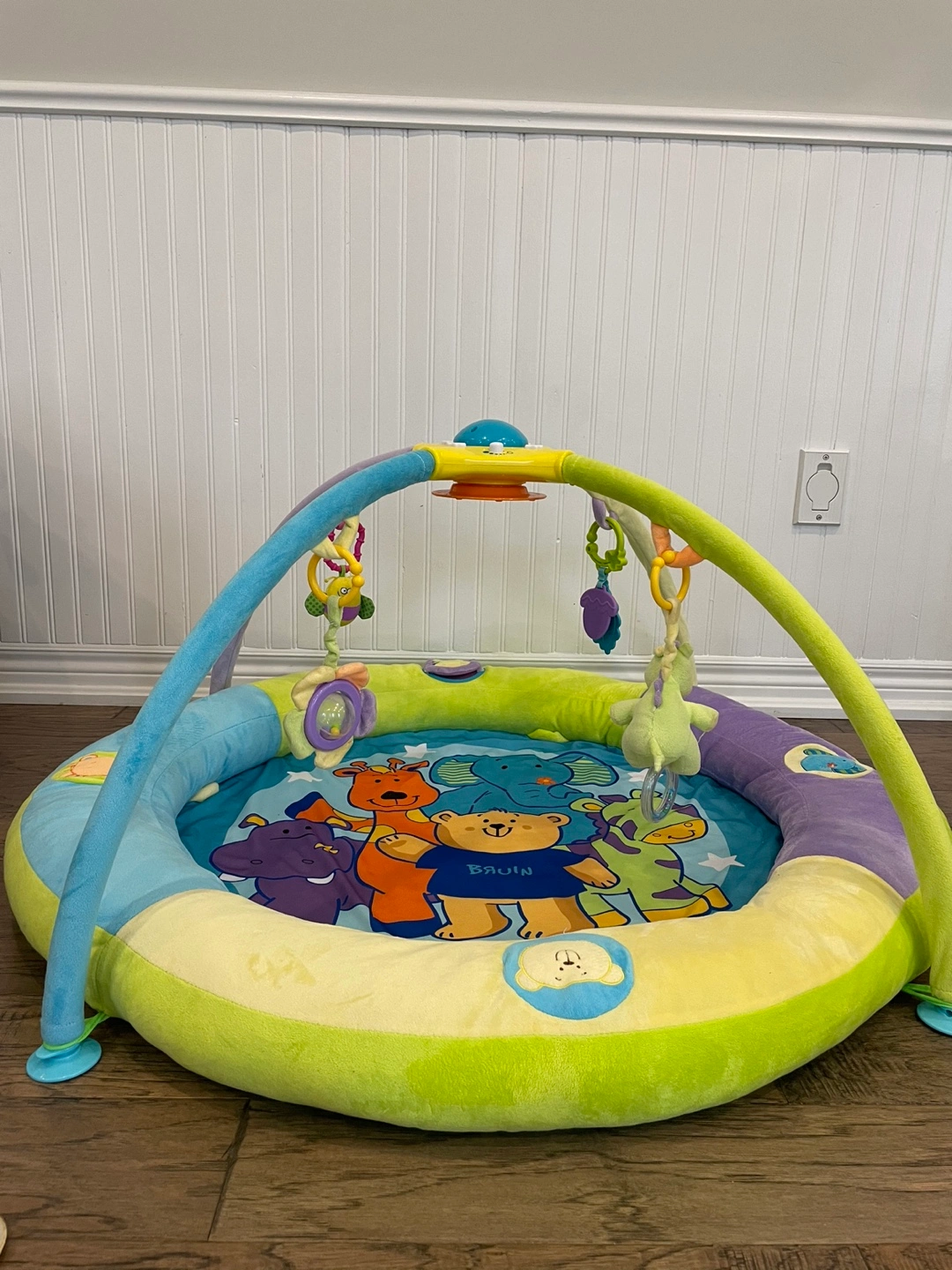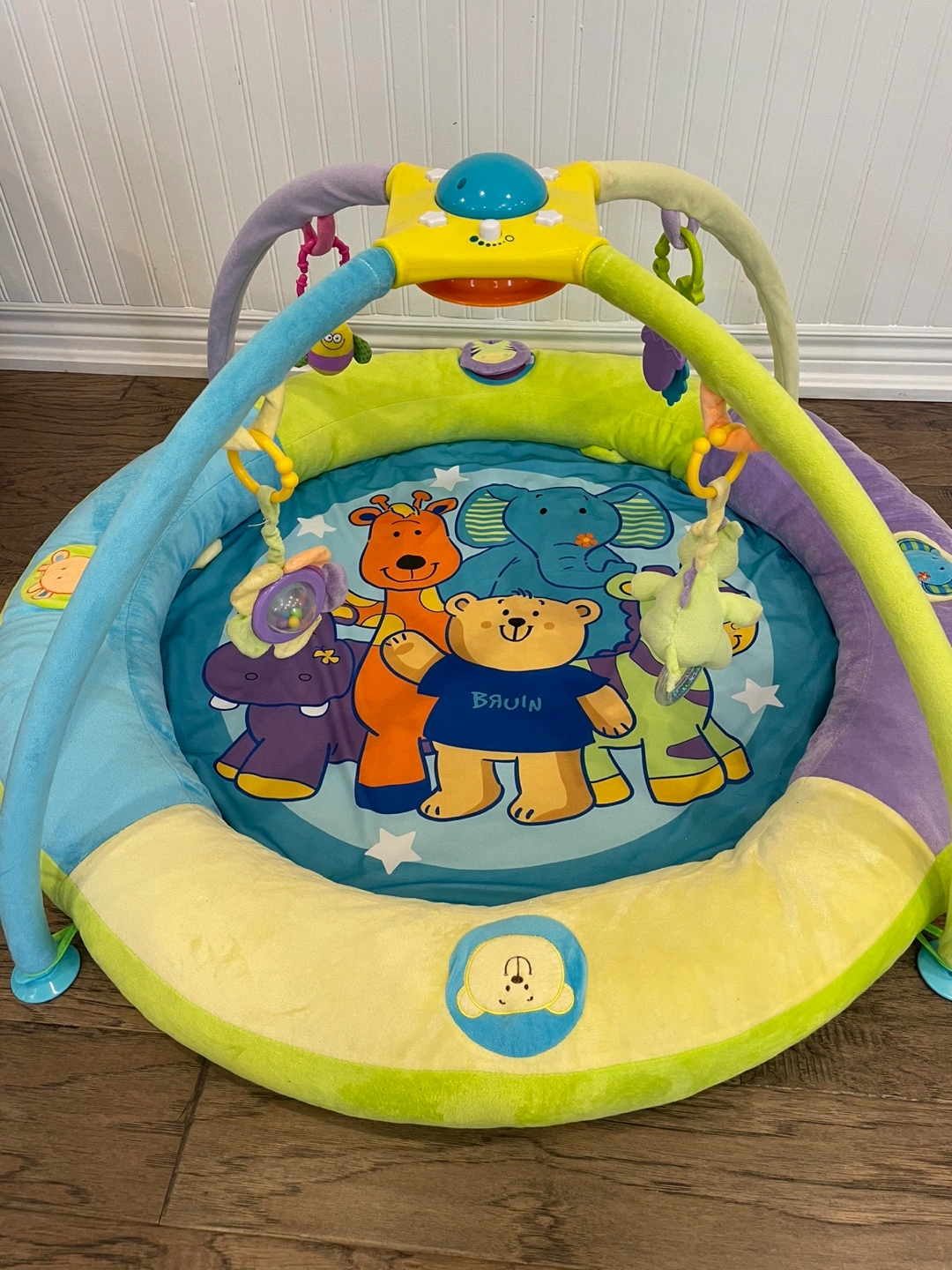 Adorable baby playmat. Features a soft, padded play surface. Bright colours and playful animal designs. Includes hanging toys for added stimulation. Great for tummy time and playtime.