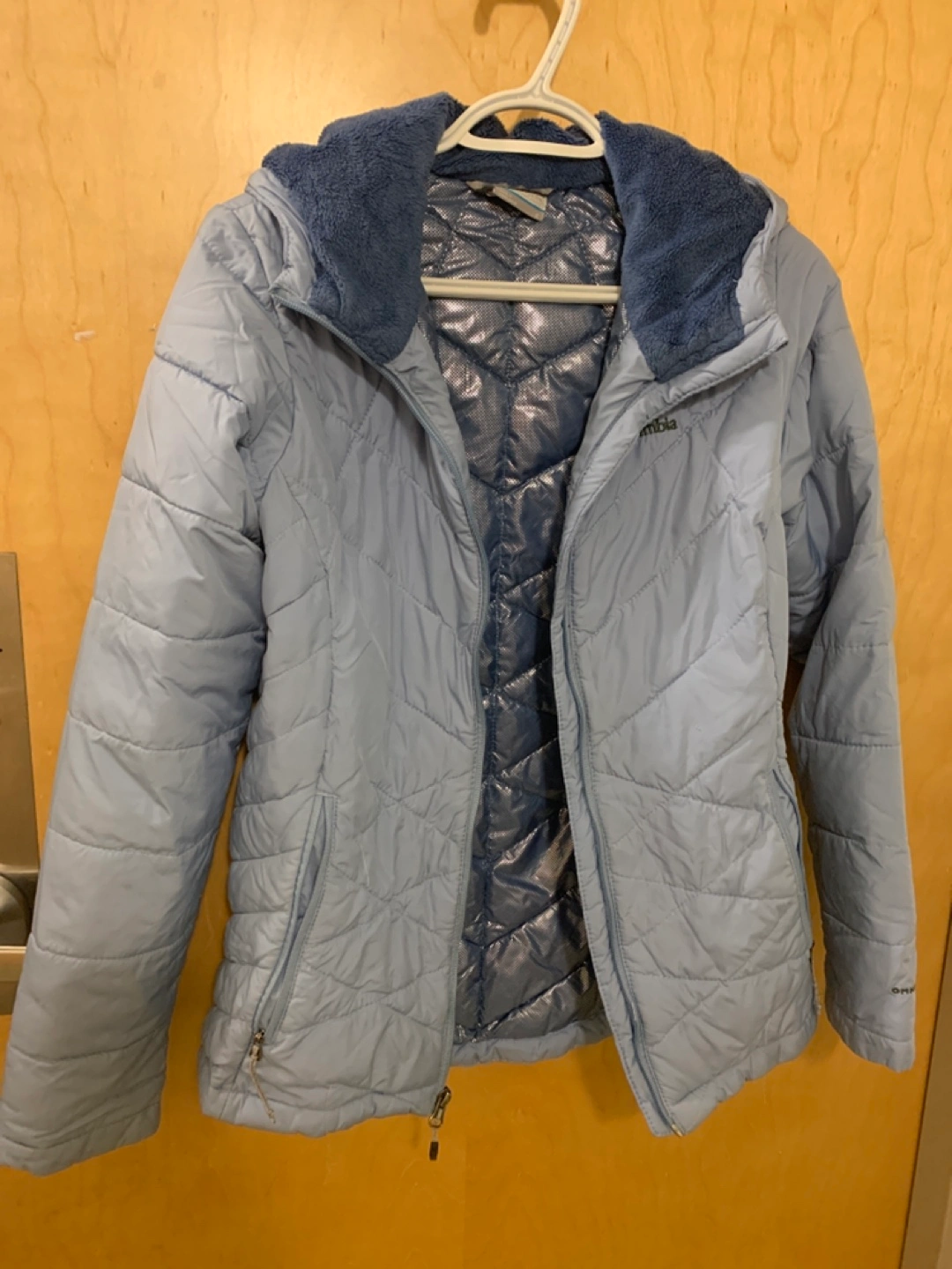 Lightweight quilted jacket. Features a fleece-lined hood and zipper closure. Great for layering. Size small.