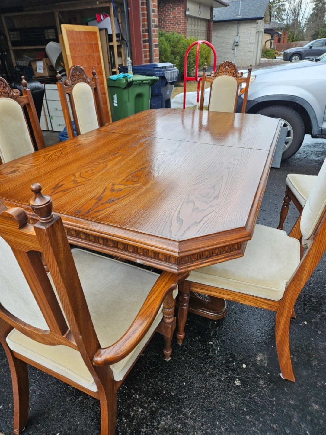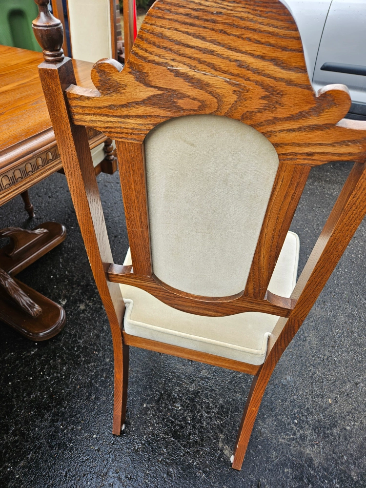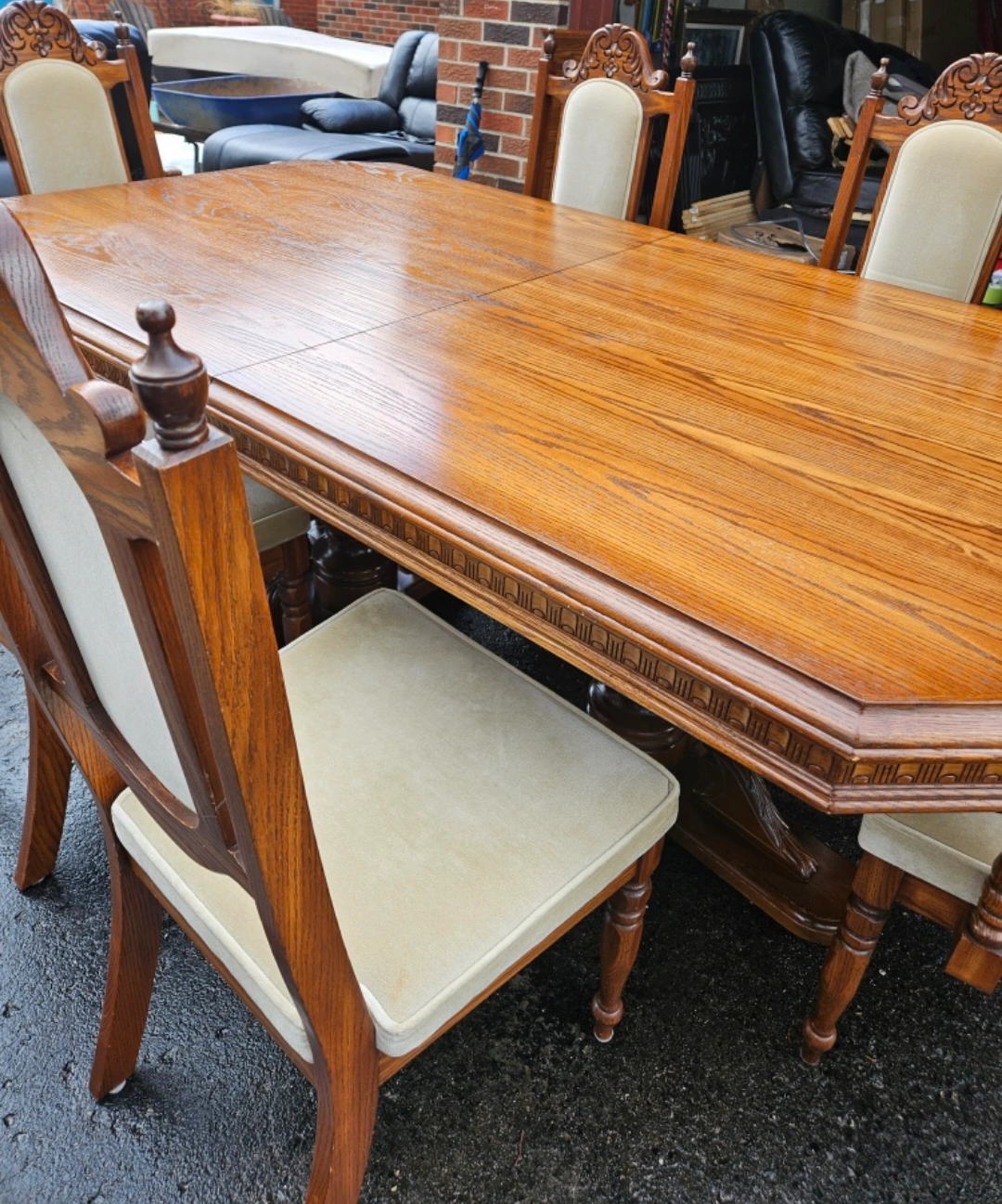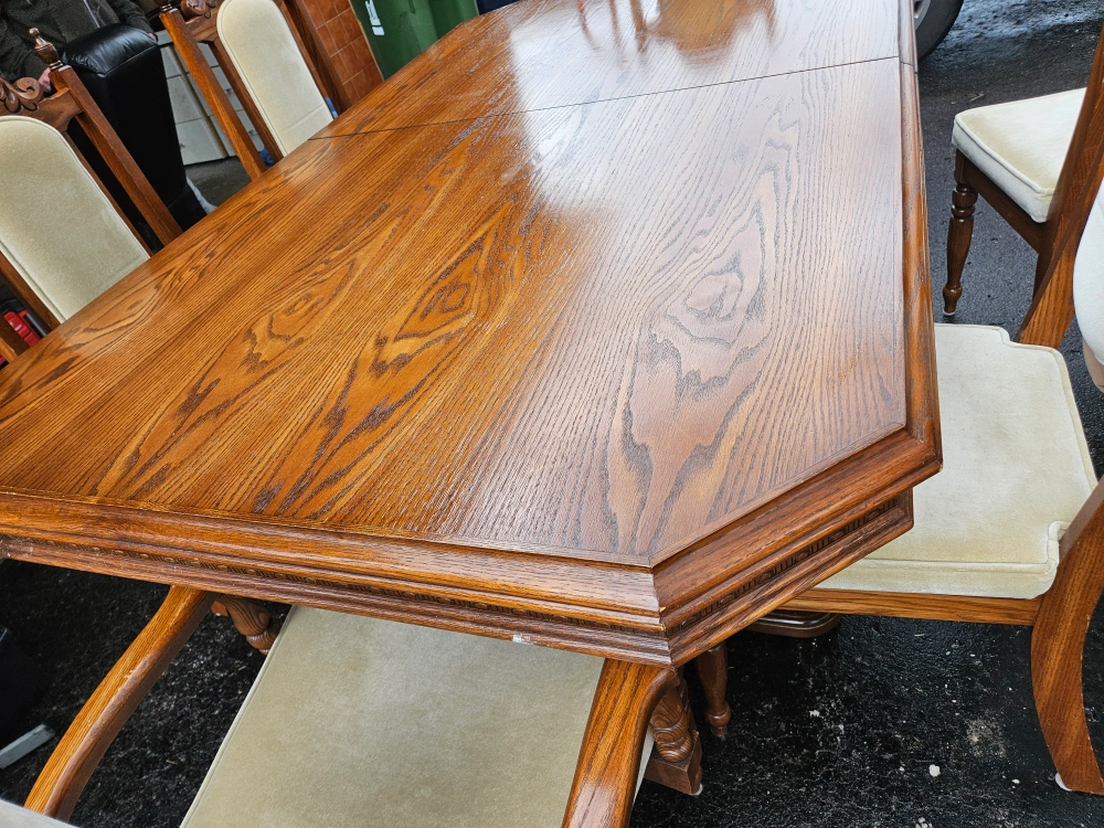 Beautiful antique dining set. Solid oak construction. Features an extendable table and six chairs. Cream coloured upholstery. Ornate detailing. Excellent condition.
