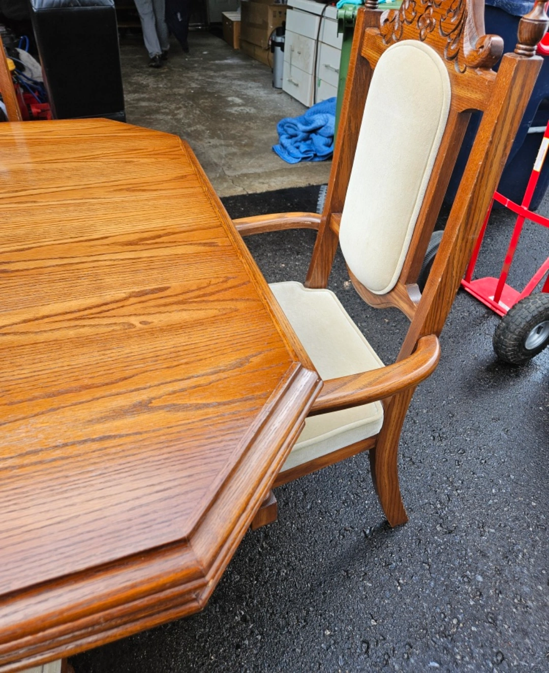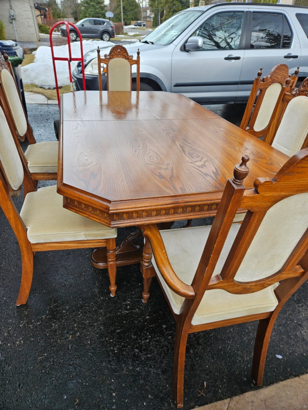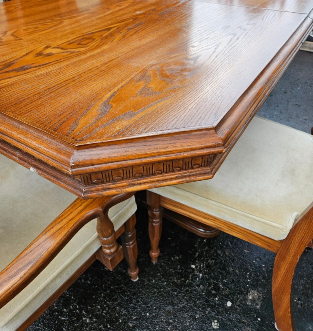 Beautiful antique dining set. Solid oak construction. Features an extendable table and six chairs. Cream coloured upholstery. Ornate detailing. Excellent condition.