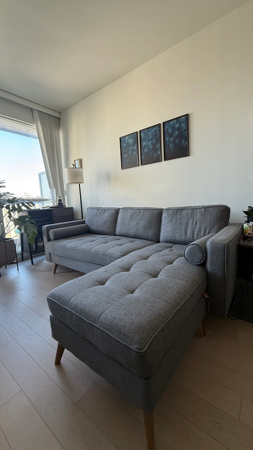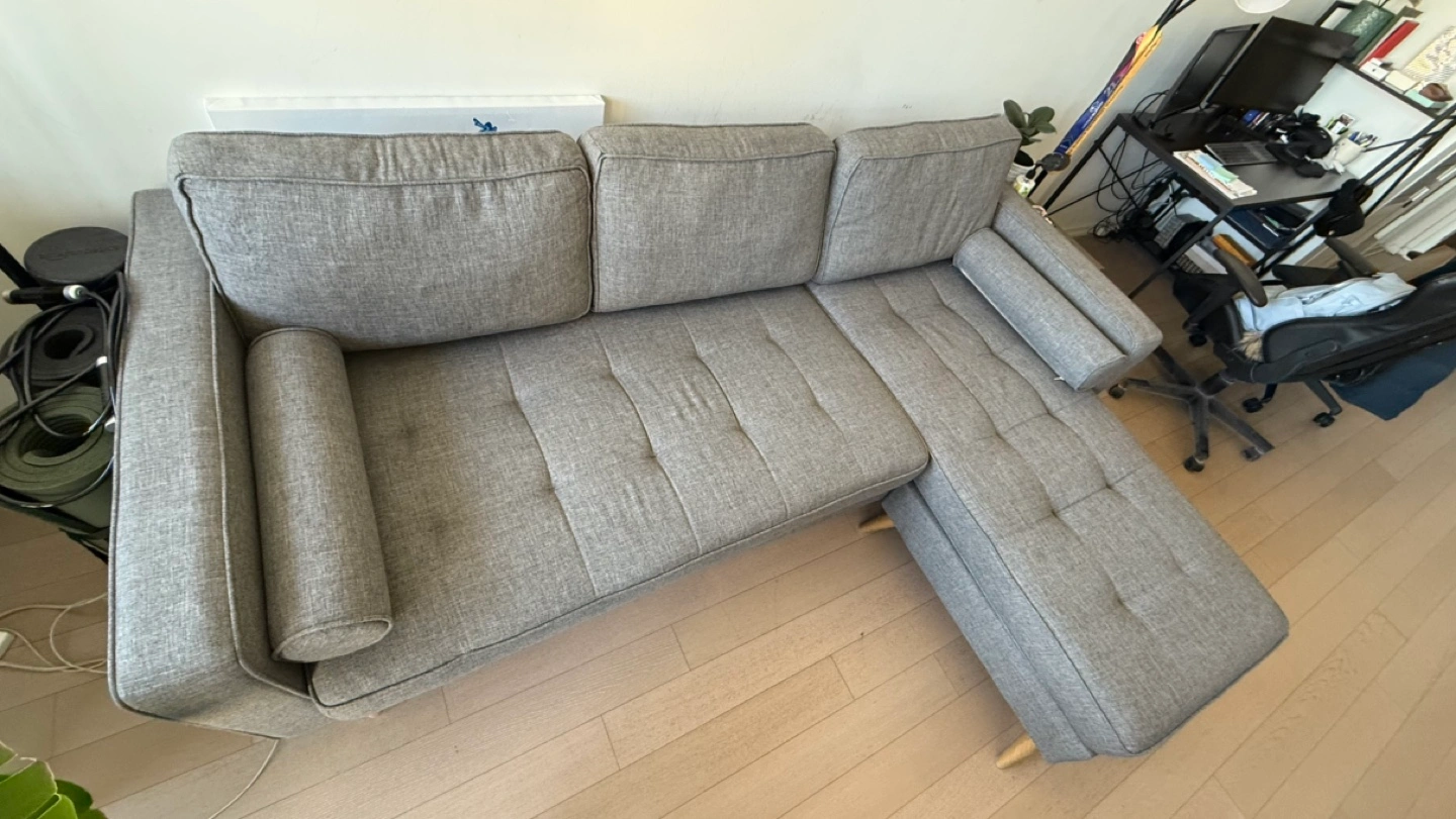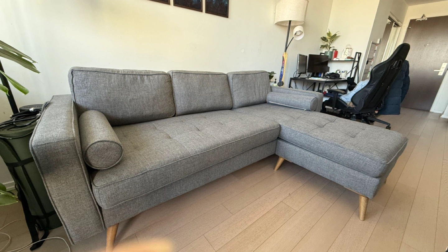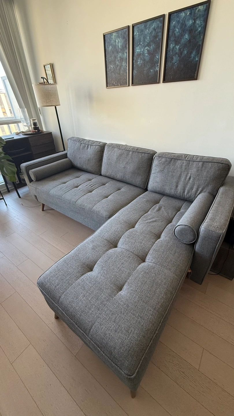 This is a very clean, smoke-free sectional sofa, one year old, and in great condition. It’s free from stains, pets, and children. The chaise lounge can be attached to either end, making it a versatile fit for any space. The sofa is extremely comfortable, with soft cushions and durable fabric, perfect for lounging or entertaining.
