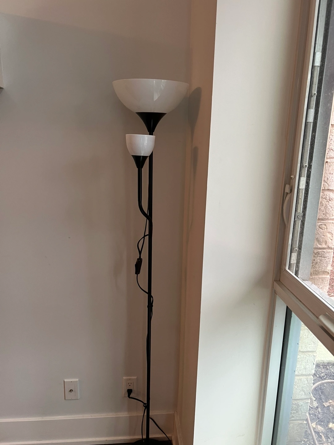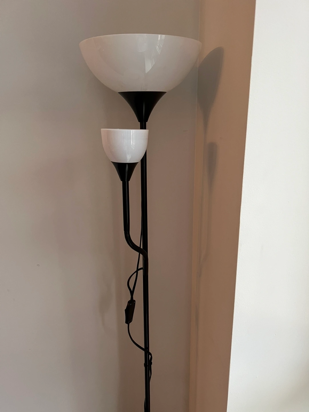 Modern floor lamp, black metal frame. Two white shades. Great for living room or bedroom. Simple design, functional lighting.