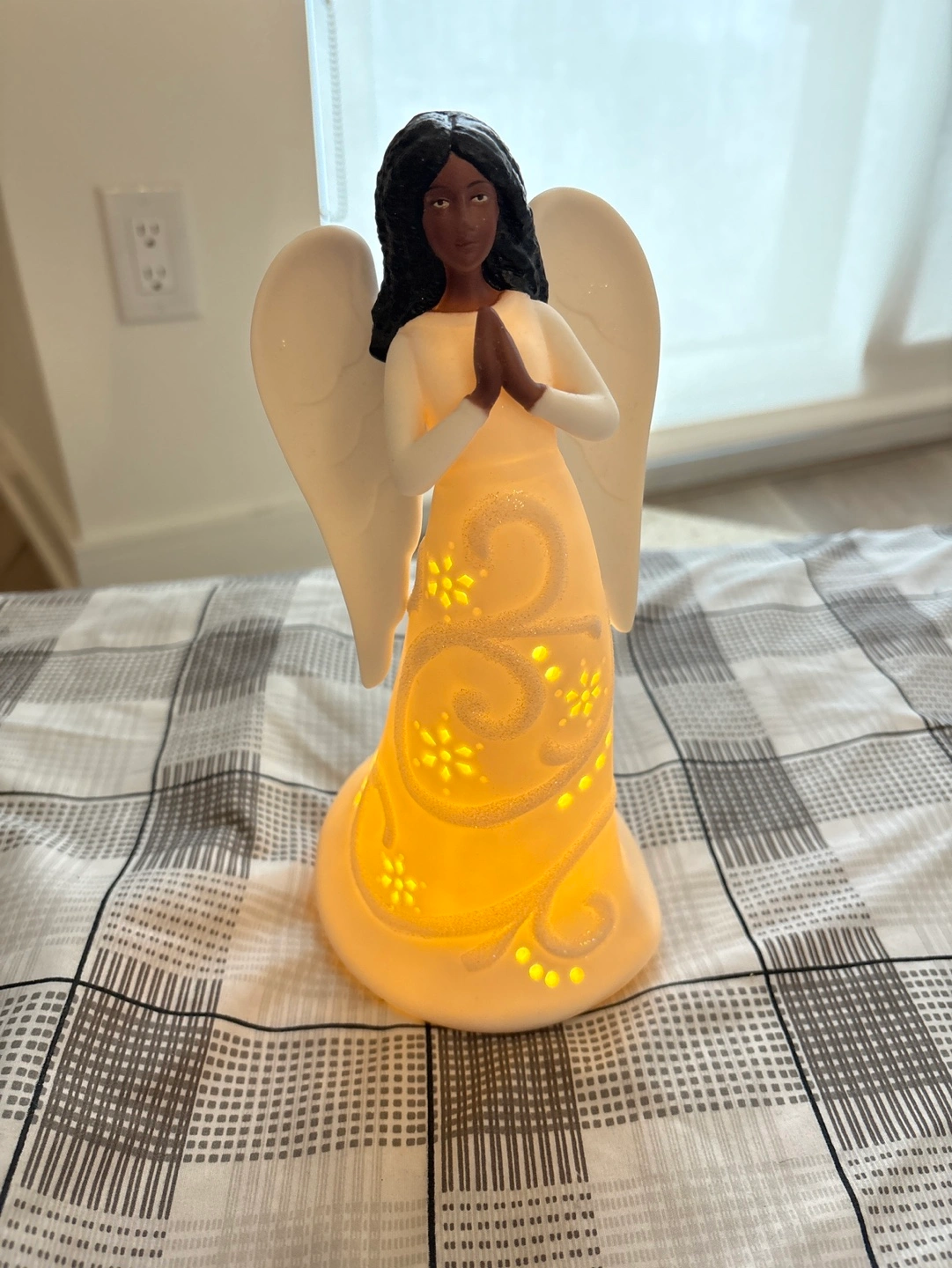 Ceramic angel figurine. Features light-up design. Black woman angel with white wings. Praying pose.