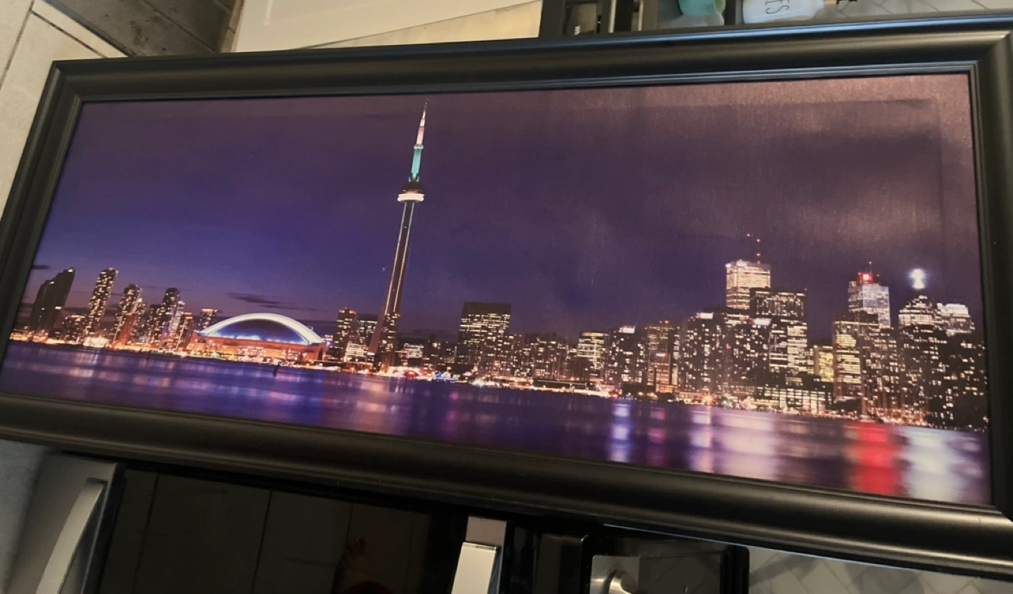 Large framed canvas print. Features a nighttime view of Toronto's skyline, including the CN Tower and Rogers Centre. Black frame.