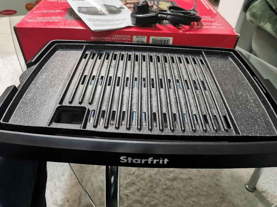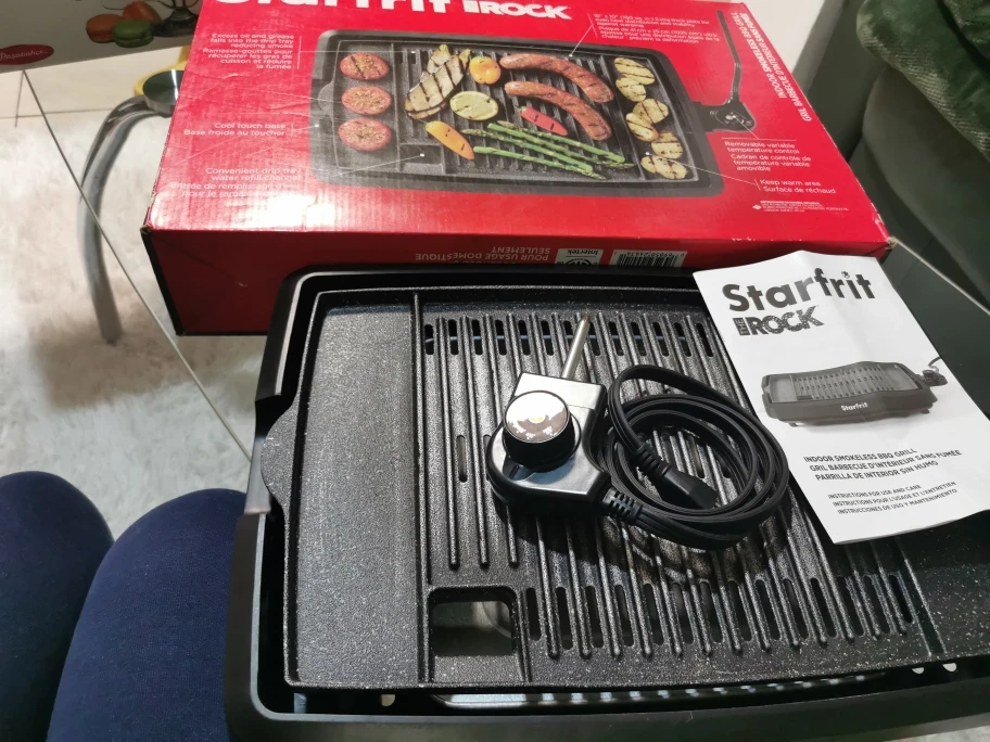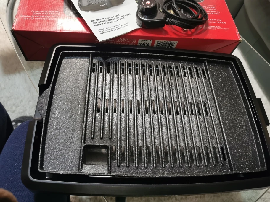 Indoor smokeless grill. Features a non-stick grilling surface. Includes temperature control. Great for smaller spaces.