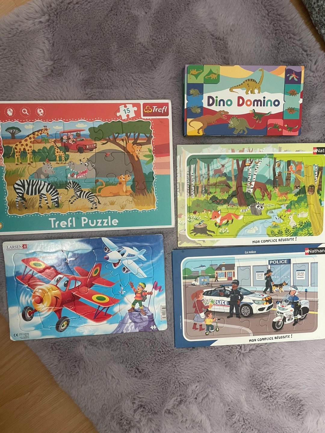 Bundle of four children's puzzles (dominoes not included). Includes a safari animal puzzle, a police-themed puzzle, a plane puzzle, and a forest animal puzzle. Great for kids aged 2+. Puzzles are in good condition.