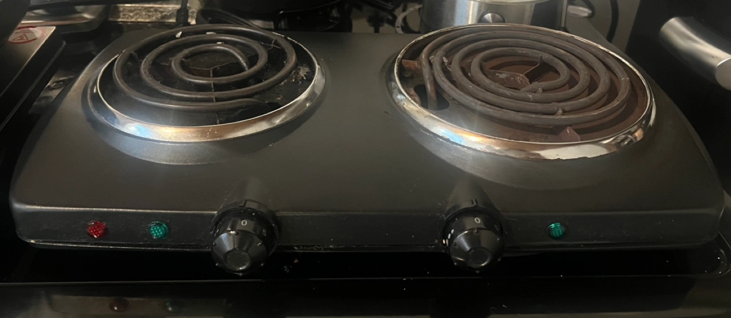 Portable double burner hot plate. Two heating elements. Individual controls and indicator lights. Great for small spaces.