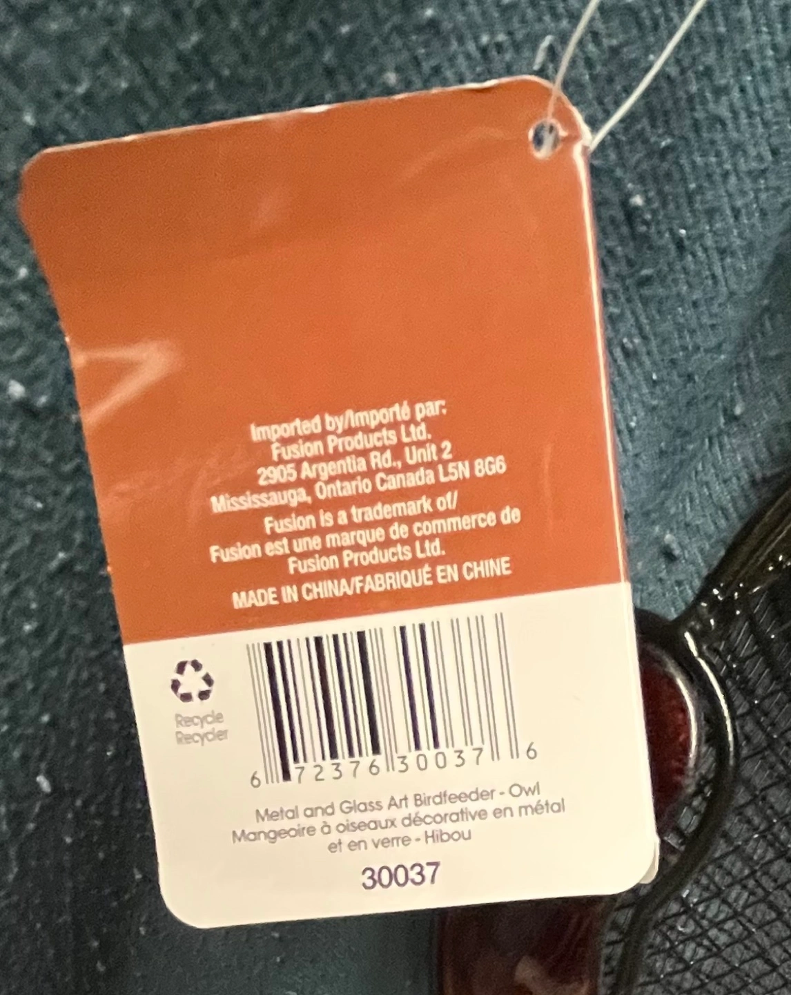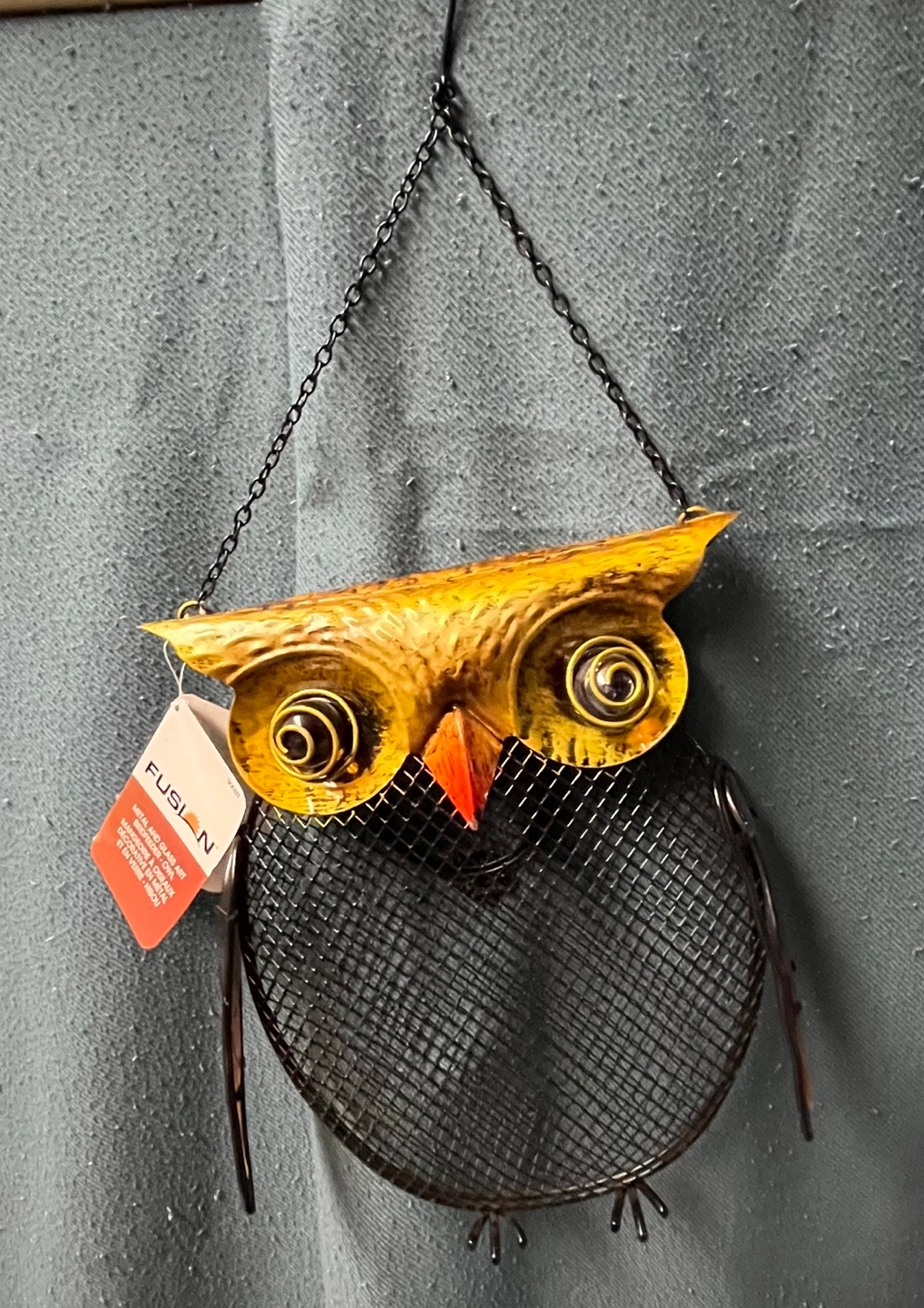 132Cute owl-shaped bird feeder. Metal mesh body with yellow metal owl face. Hanging chain included. Made in China.
