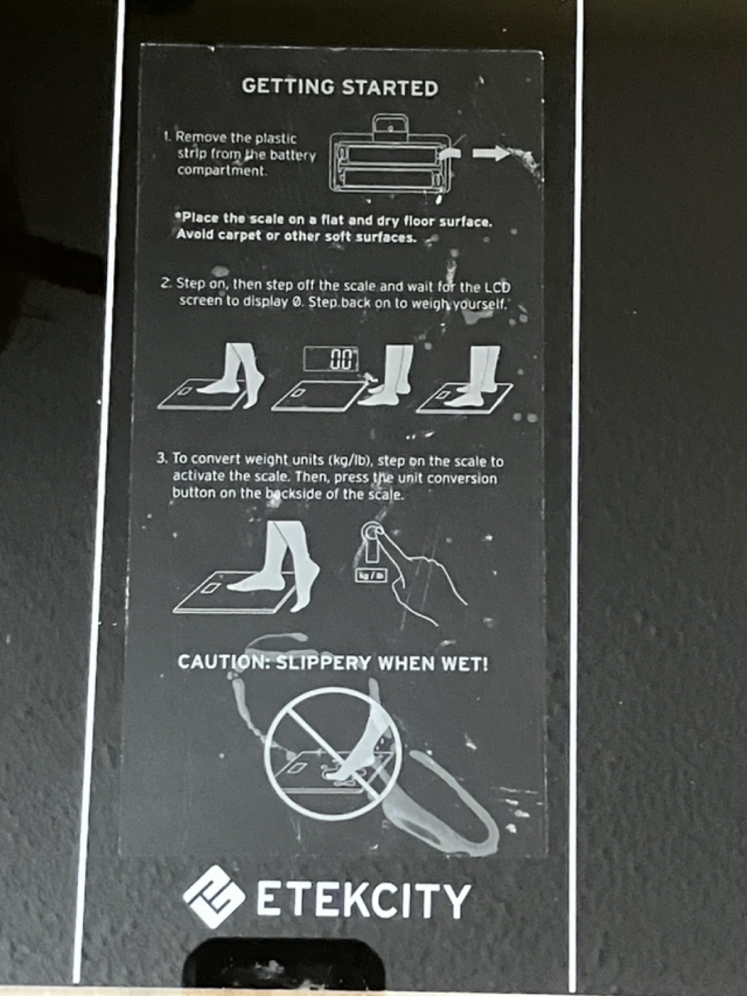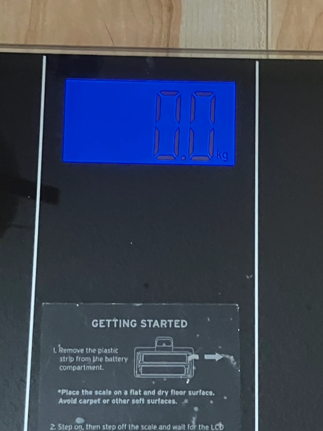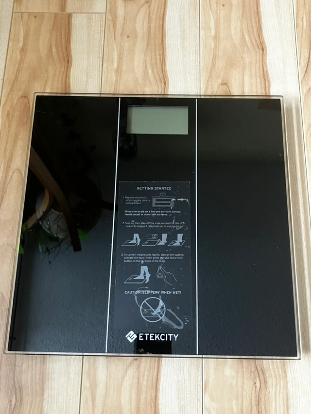 Black digital bathroom scale. LCD display shows weight in kilograms or pounds. Includes instructions. Sleek design. 1 1/2 years old. Works well. Battery included. Pick up at Carling and Pinecrest.