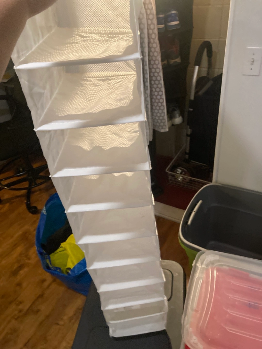 Ten-section fabric hanging shelf organizer. Great for closet organization. Collapsible design for easy storage.