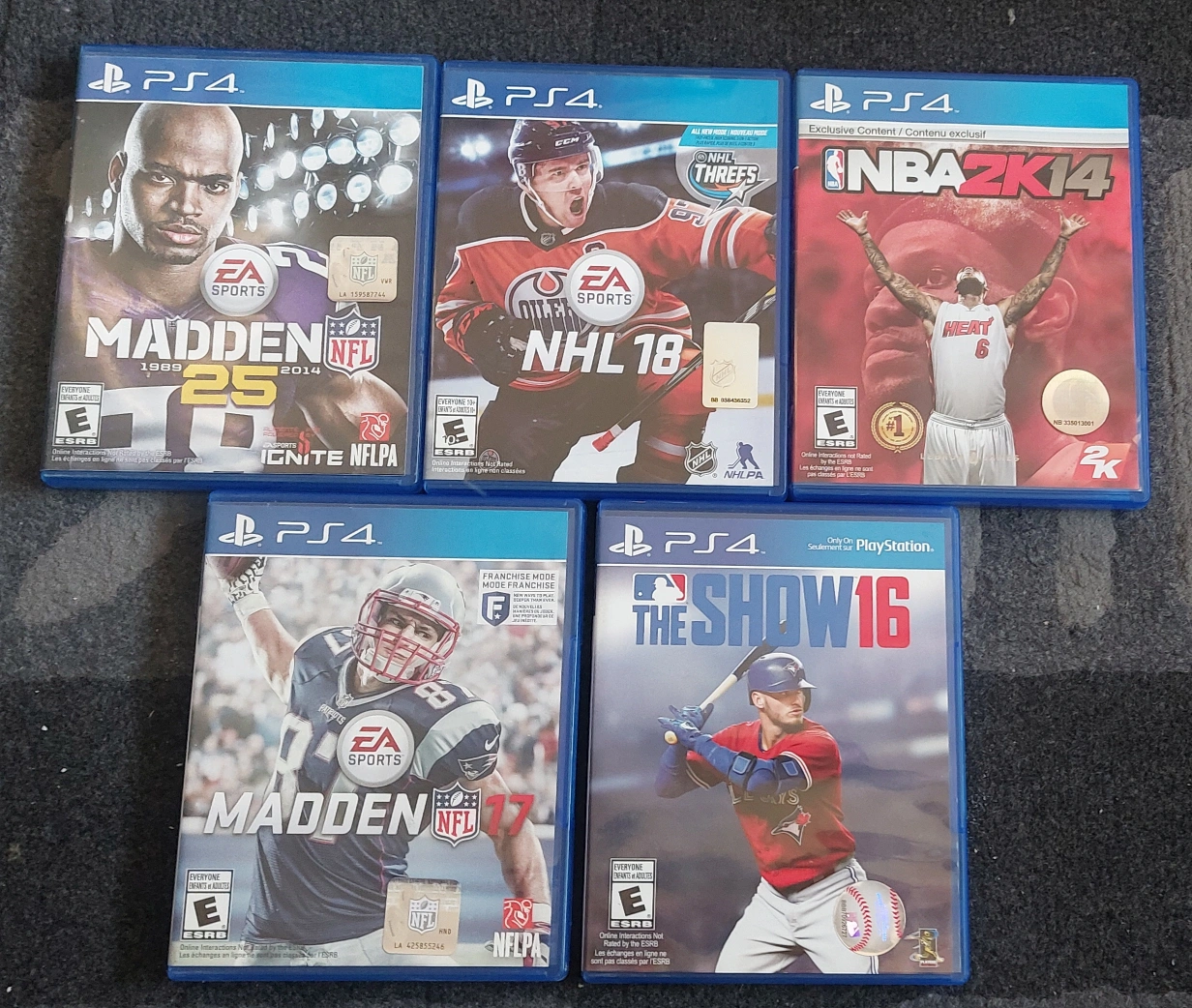 Five used PlayStation 4 game discs. Includes Madden NFL 25, Madden NFL 17, NHL 18, NBA 2K14, and MLB The Show 16. Various editions and ratings. $2 each