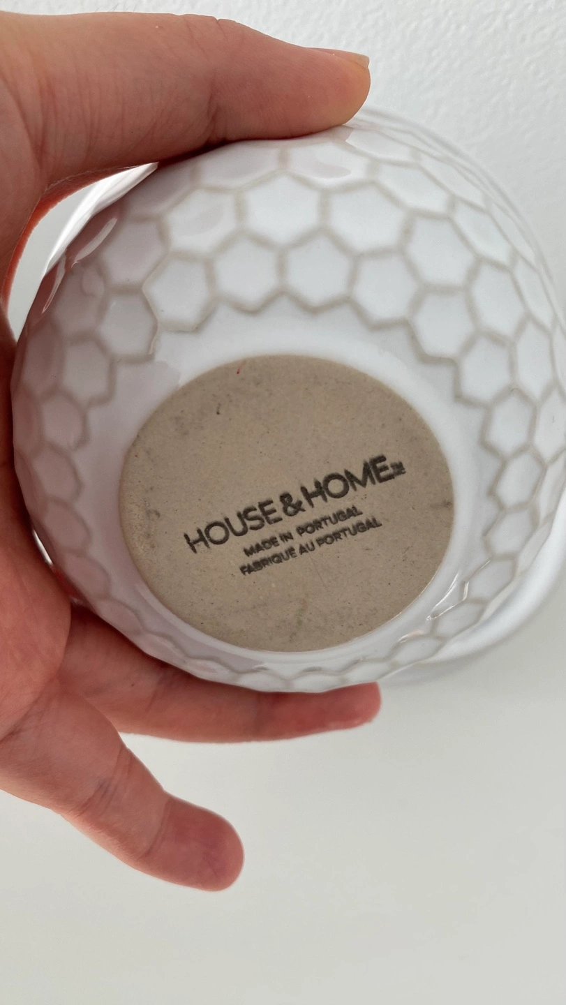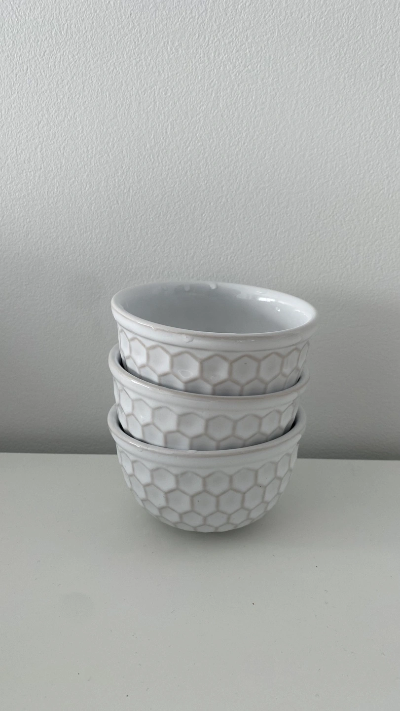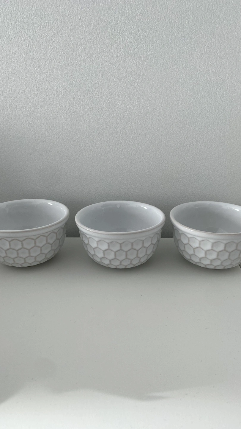 Three small white ceramic bowls. Honeycomb pattern. Perfect for snacks or dips. Made in Portugal.
