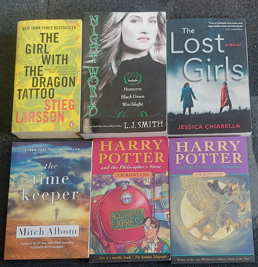 Collection of six used books. Titles include: The Girl with the Dragon Tattoo, Night World, The Lost Girls, The Time Keeper(new), Harry Potter and the Philosopher's Stone, and Harry Potter and the Prisoner of Azkaban(new). Various authors. $5 each $10 for new OBO