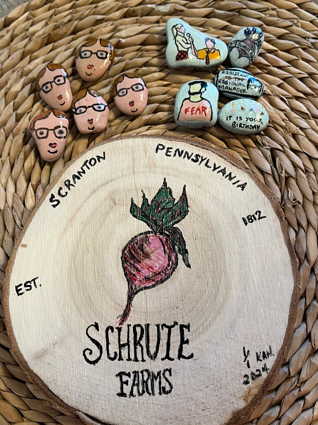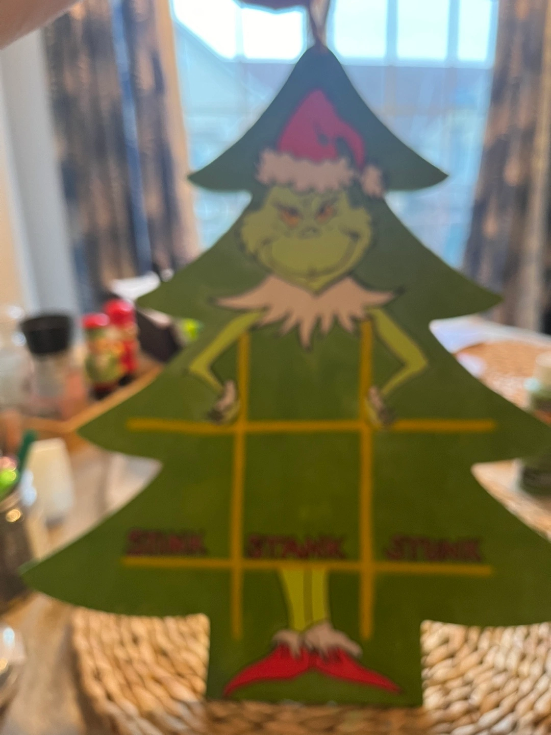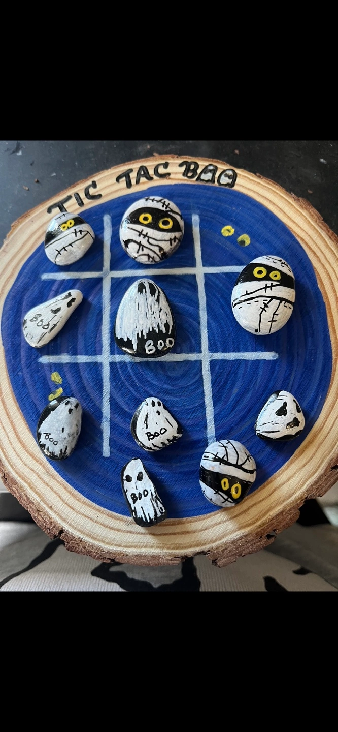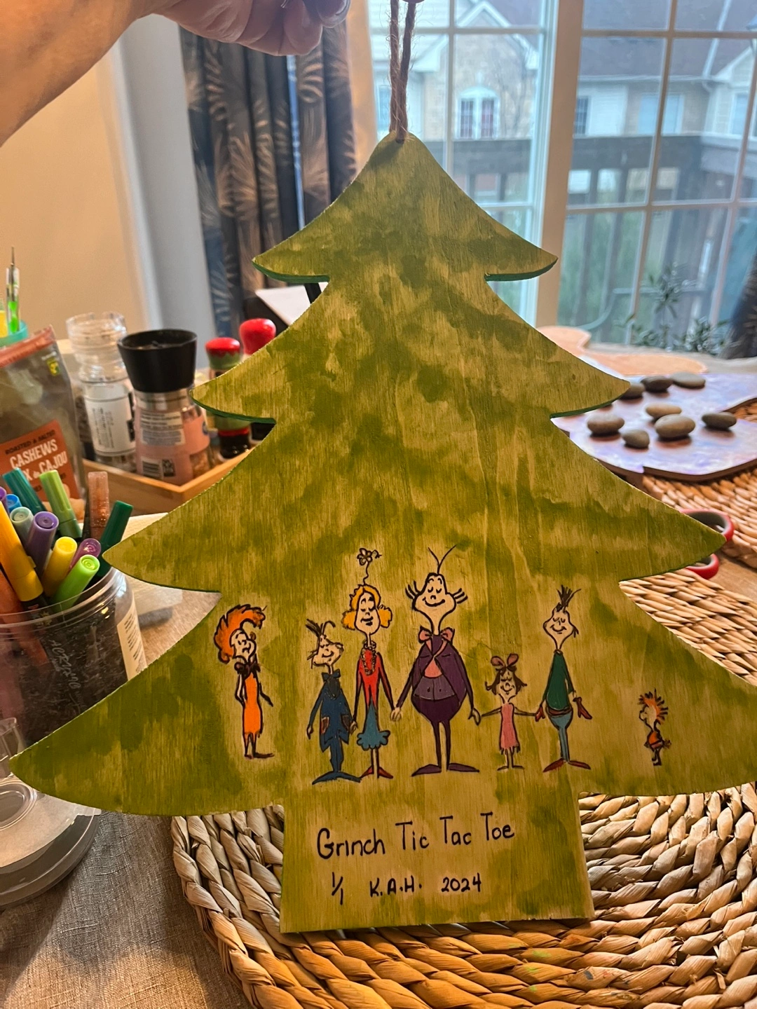 Set of three unique, hand-painted tic-tac-toe games. Grinch-themed Christmas tree ornament, Halloween-themed game on a wood slice, and Nightmare Before Christmas Jack Skellington game. Great for gifting or holiday fun. Rocks included.