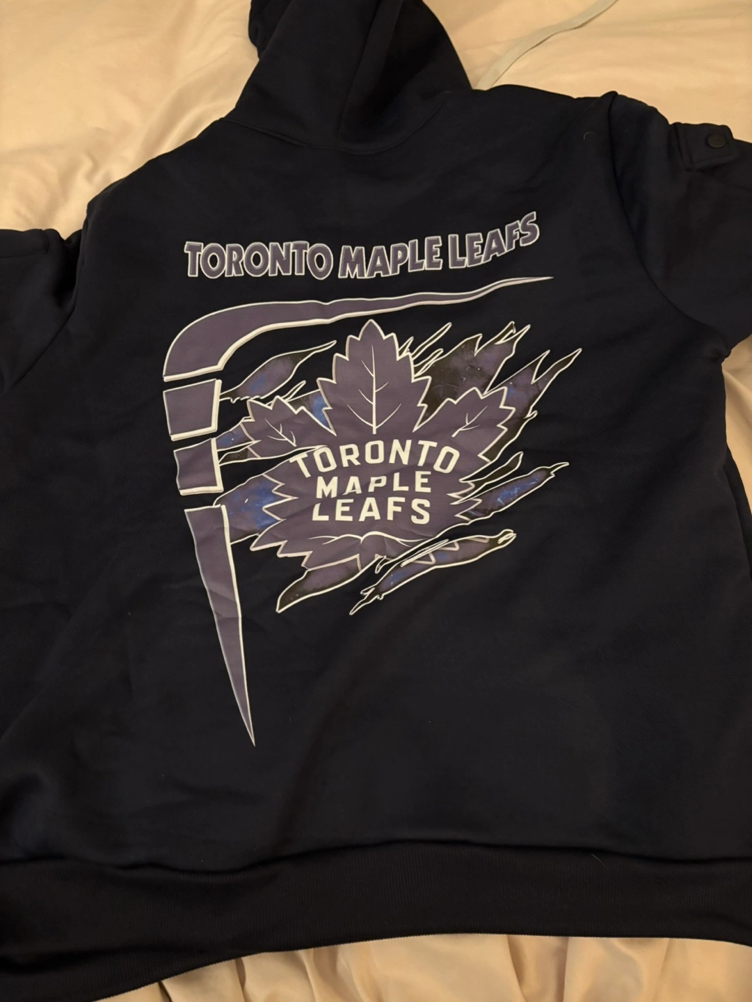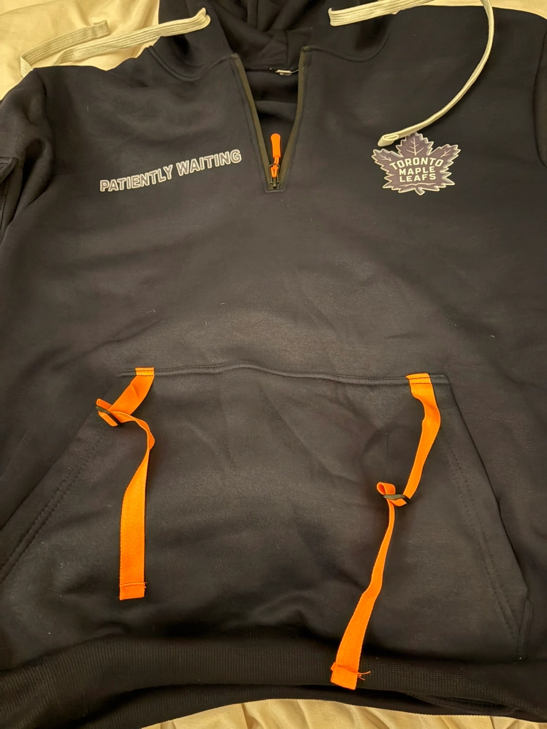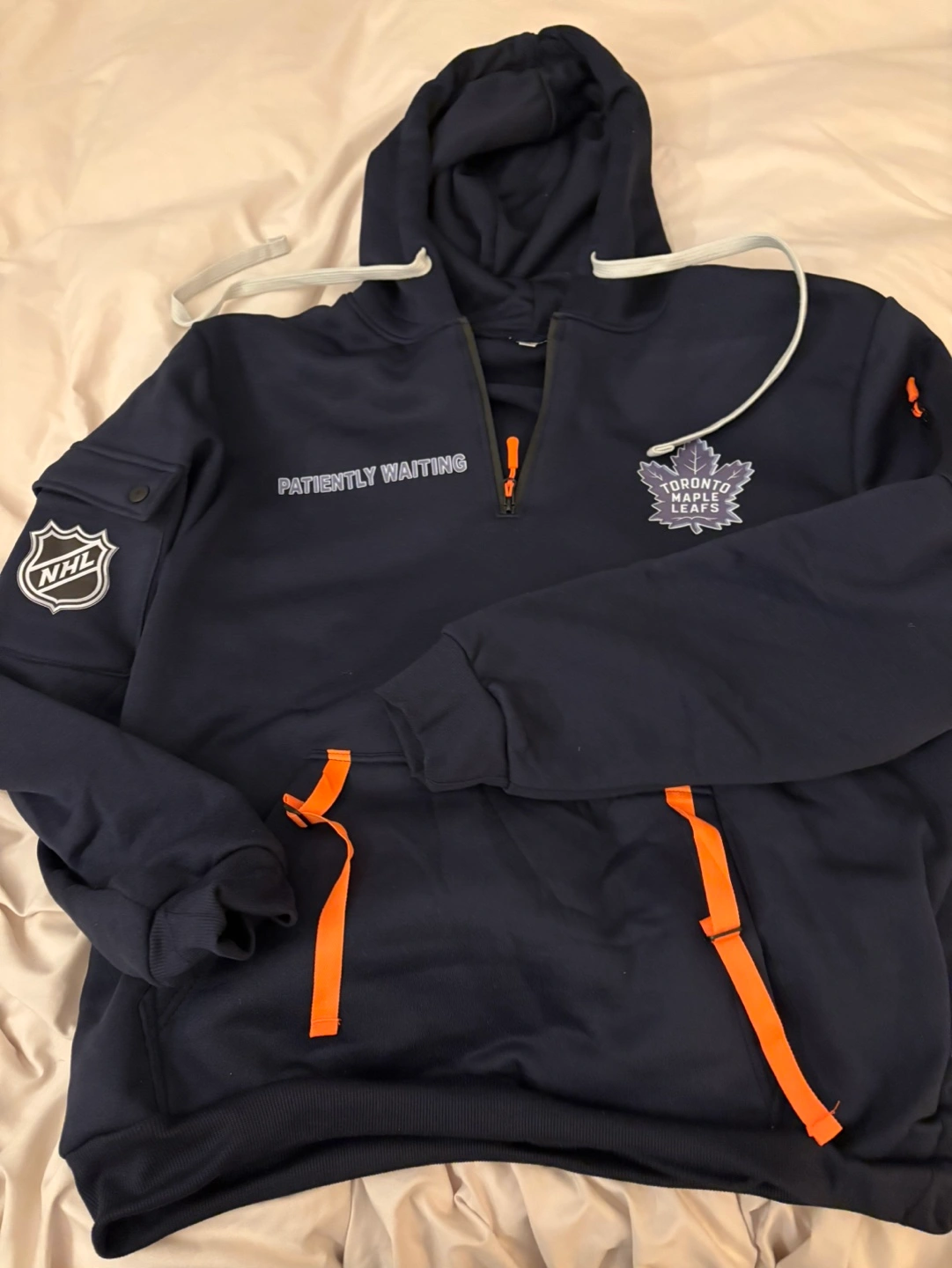 936Men's navy blue pullover hoodie. Features Toronto Maple Leafs logo and NHL patch. Half-zip closure. Orange accents. 'Patiently Waiting' text on the front. Unique back design.