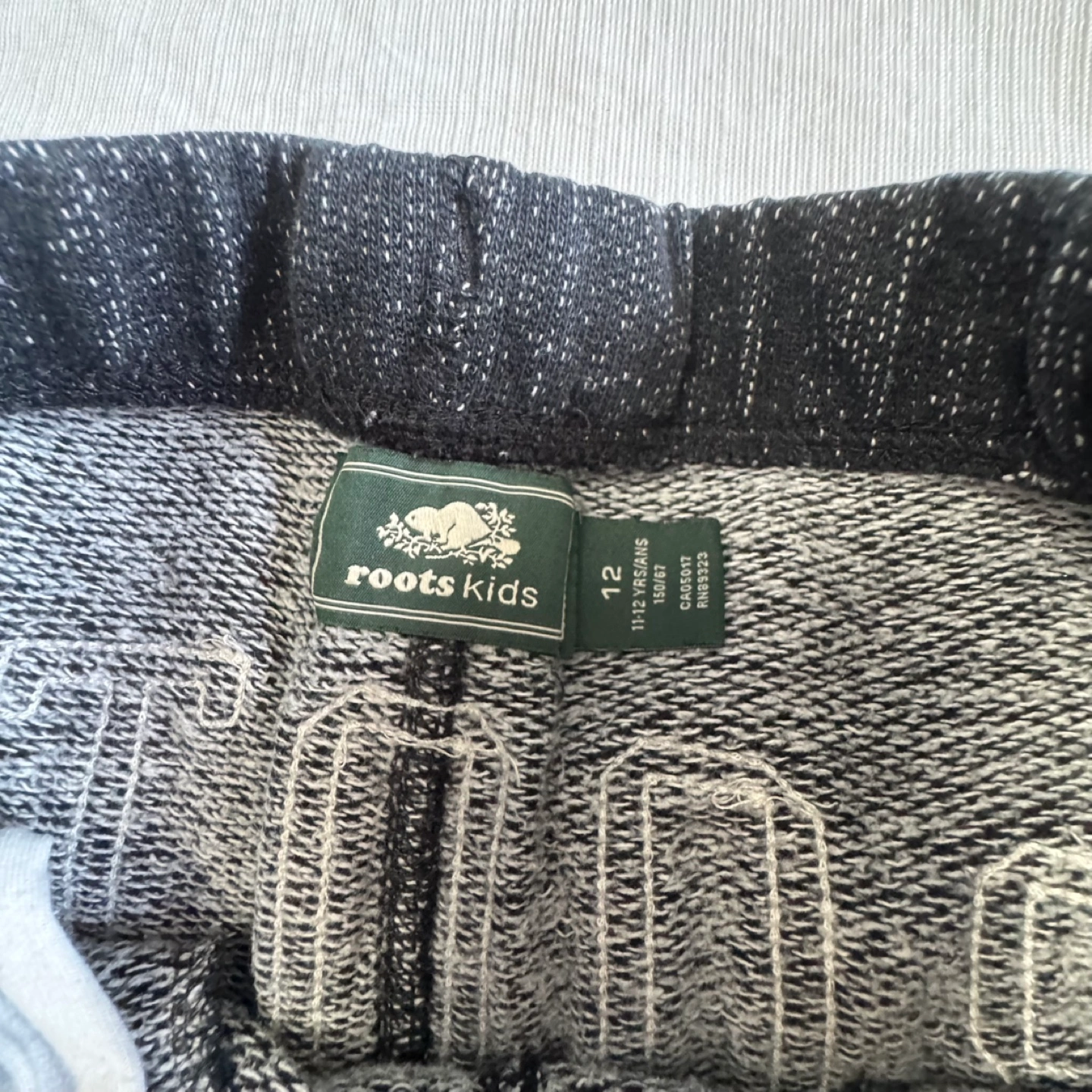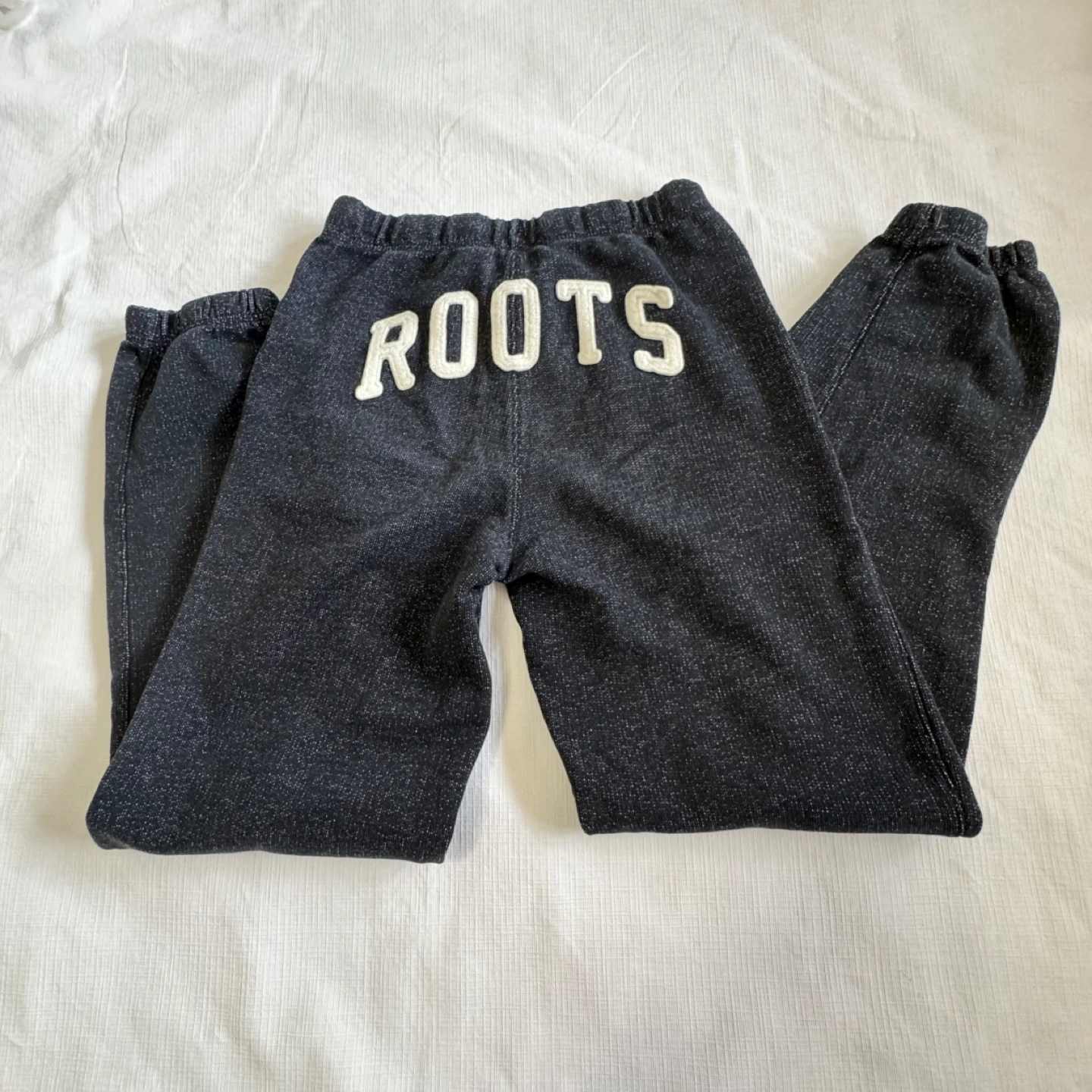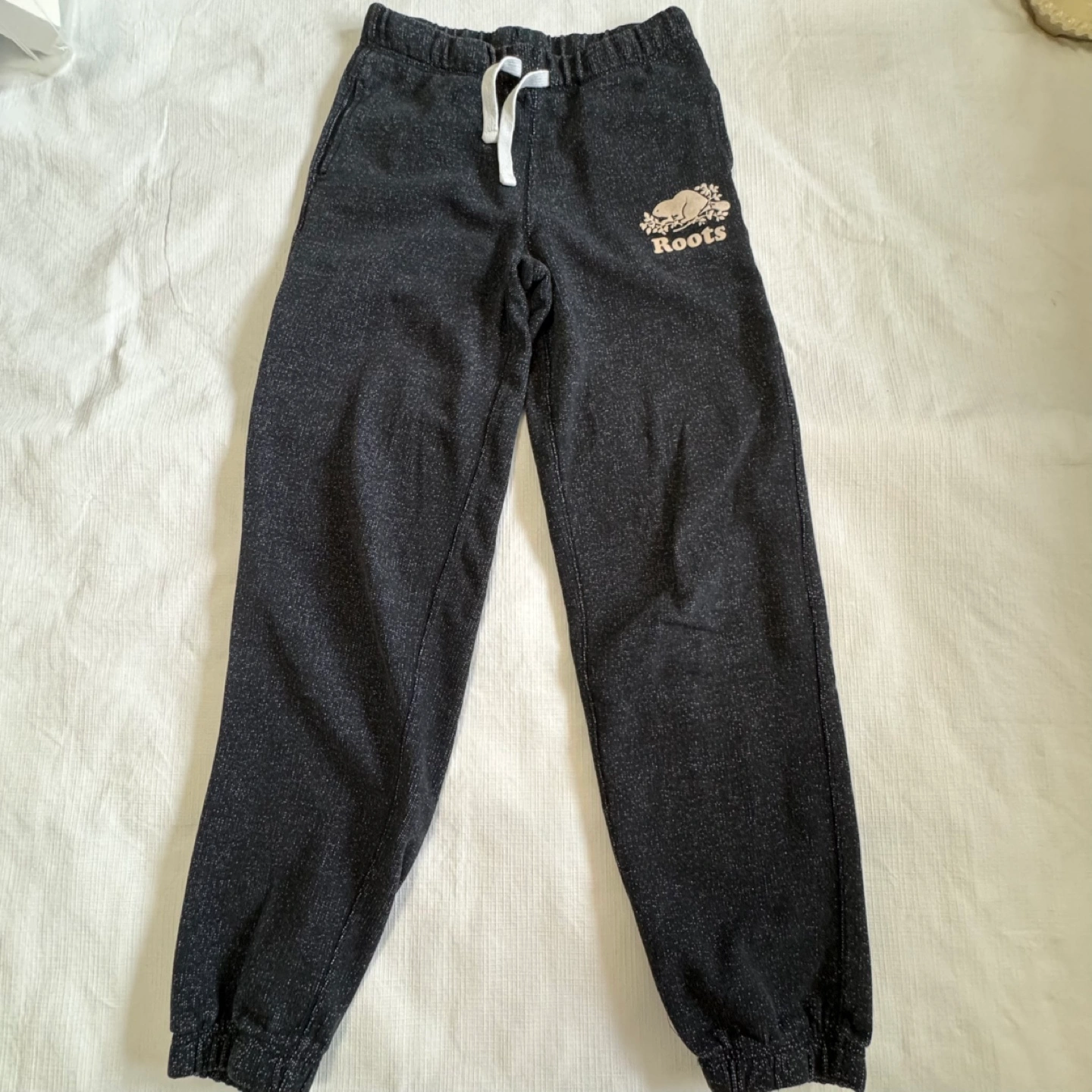 18Black jogger pants. Size 12. Elastic waistband with drawstring. Features Roots logo on one leg and back. Good used condition.
