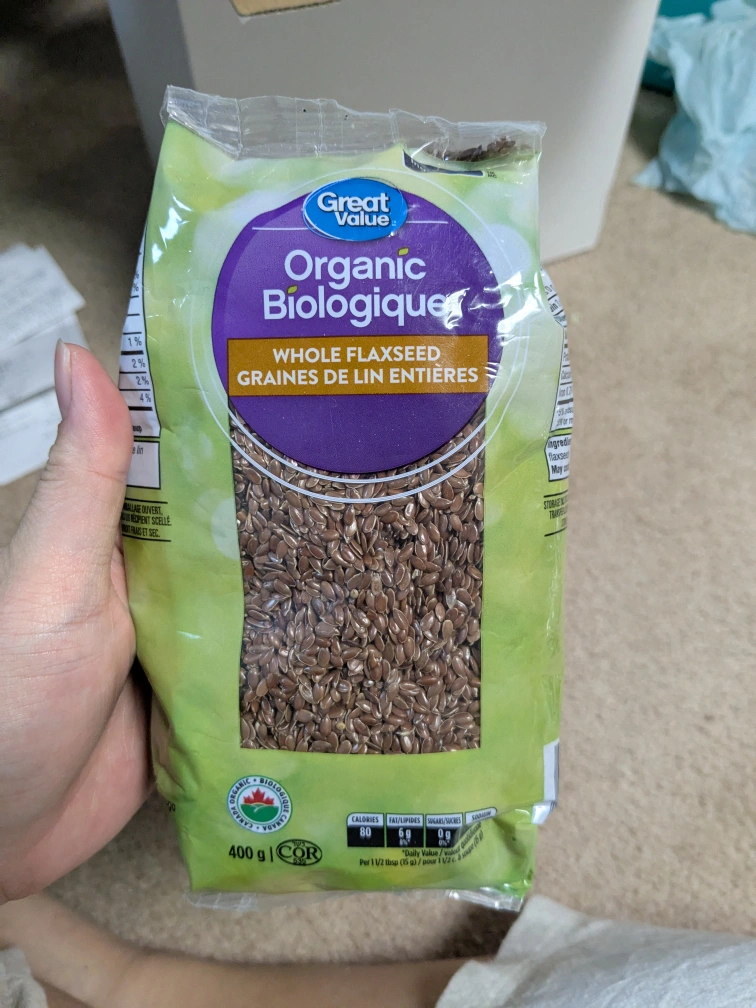 Bag of Great Value brand organic whole flaxseed. 400 grams.