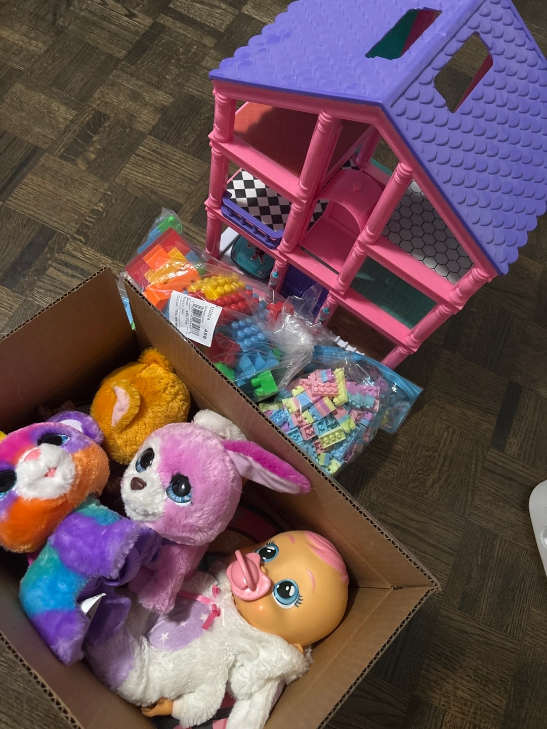 564Large toy bundle including a three-story pink and purple dollhouse, pastel-coloured building blocks, and three assorted plush toys. Perfect for imaginative play!