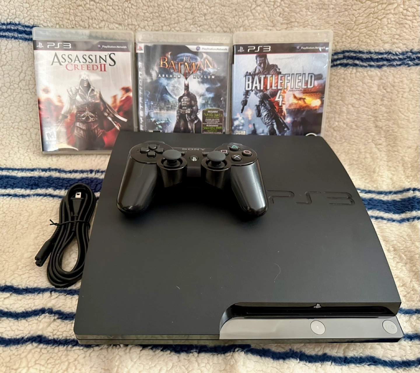 Includes a controller and three games (Assassin’s Creed 2, Batman: Arkham Asylum, Battlefield 4). Has been fully tested to confirm everything works.