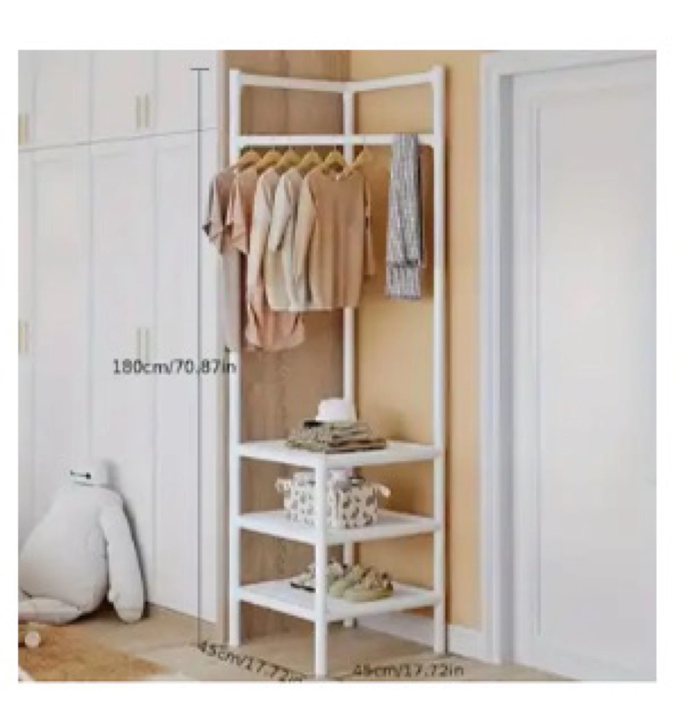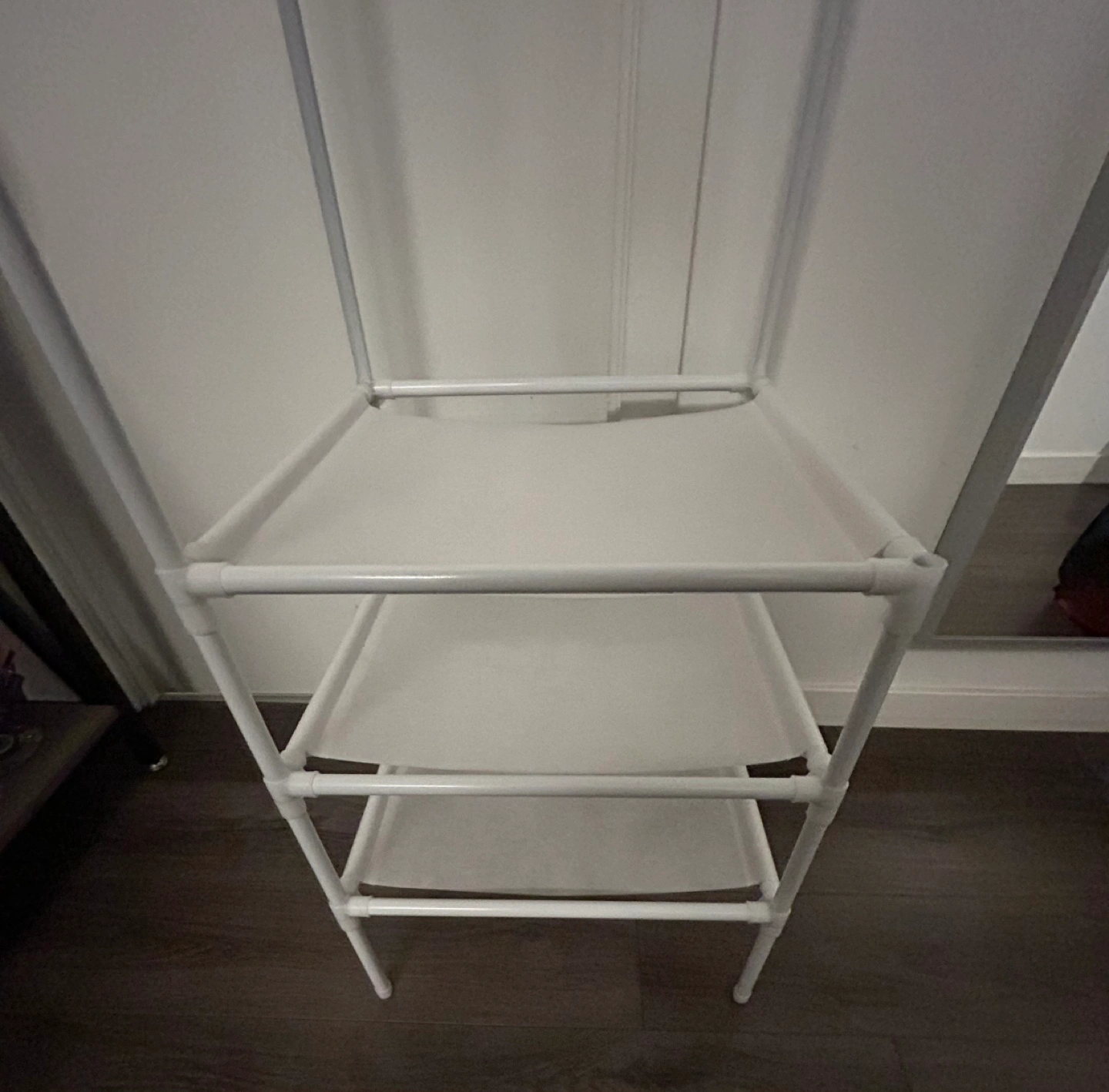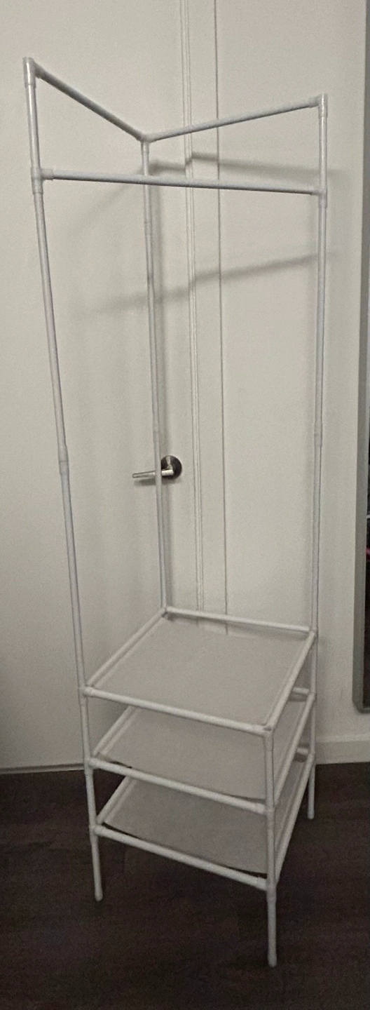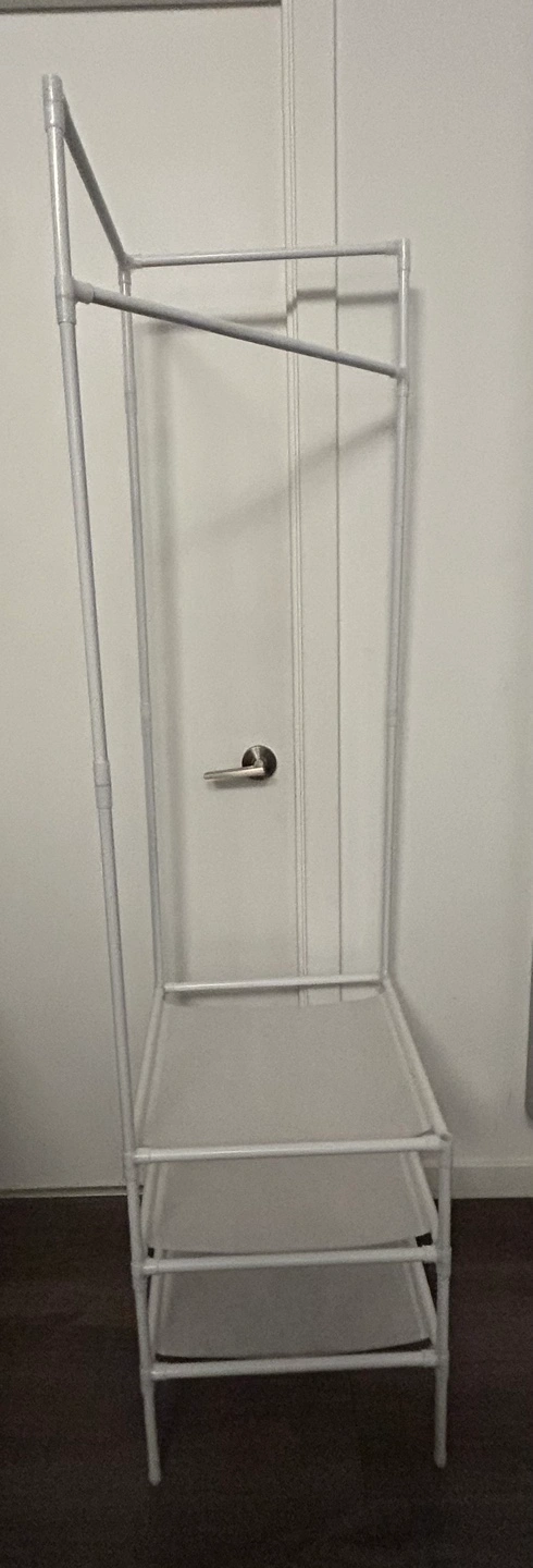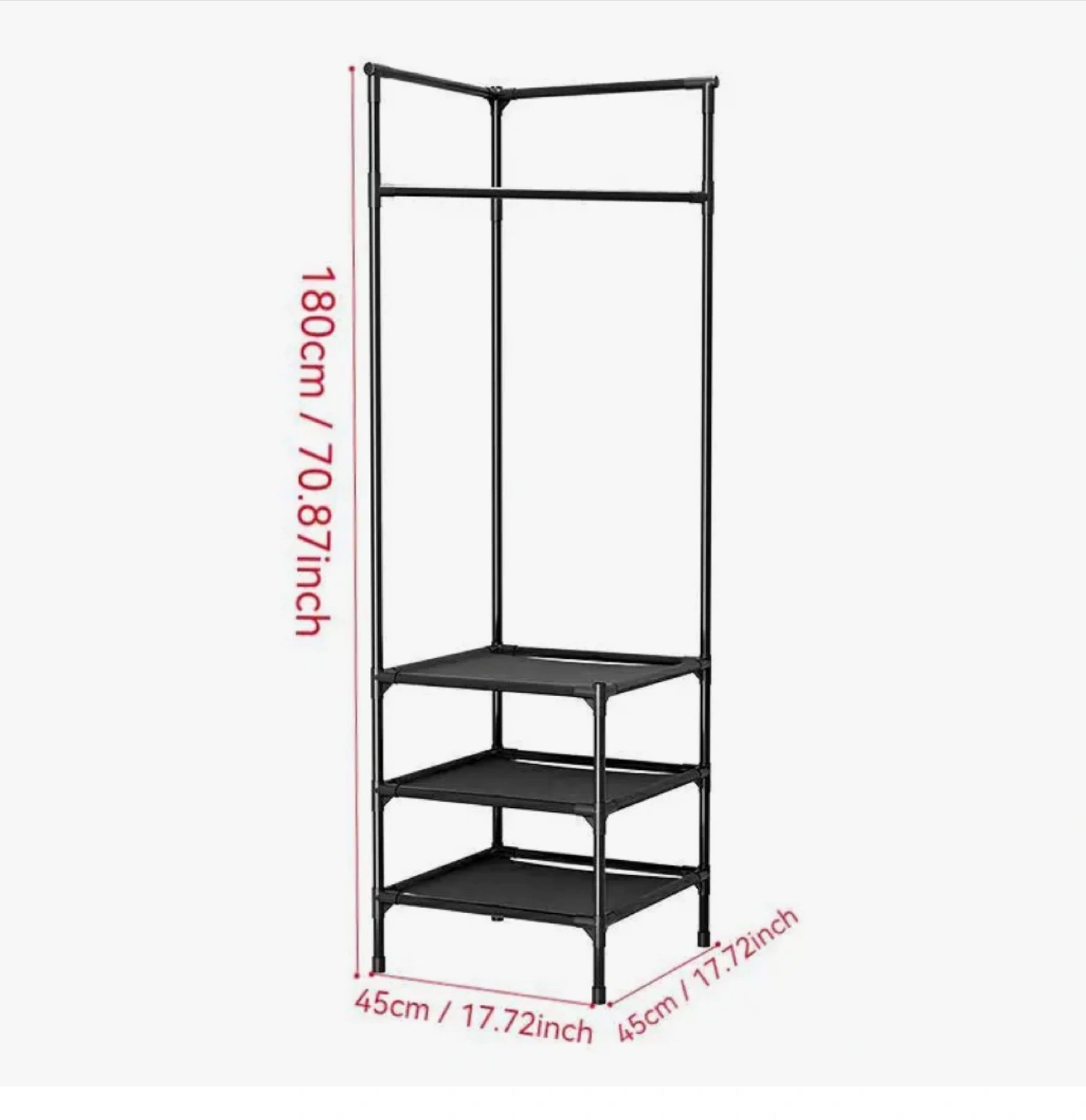 Freestanding wardrobe organizer. Features a clothes rail and two fabric shelves. Simple assembly required. Suitable for small spaces and light clothing.