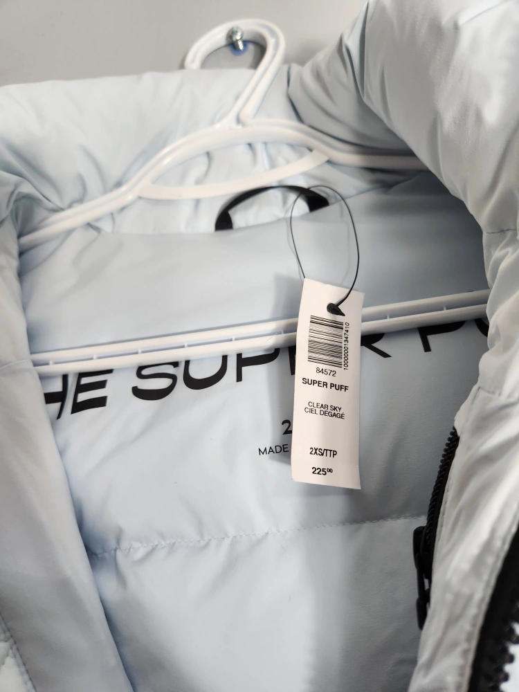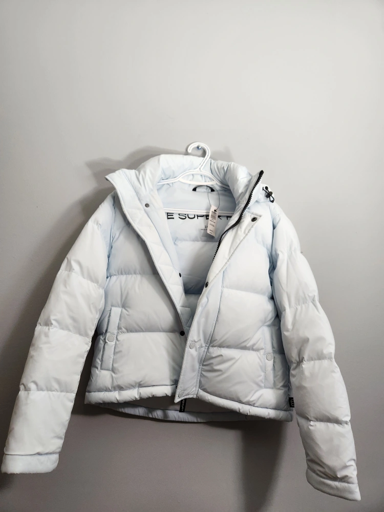 The Super Puff Light Blue Cropped Puffer Jacket with a tag