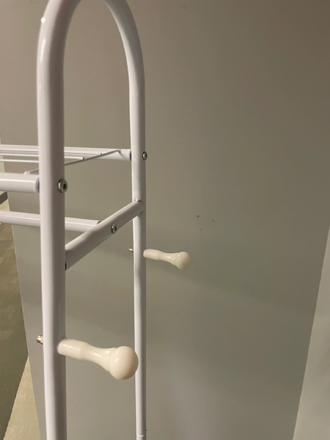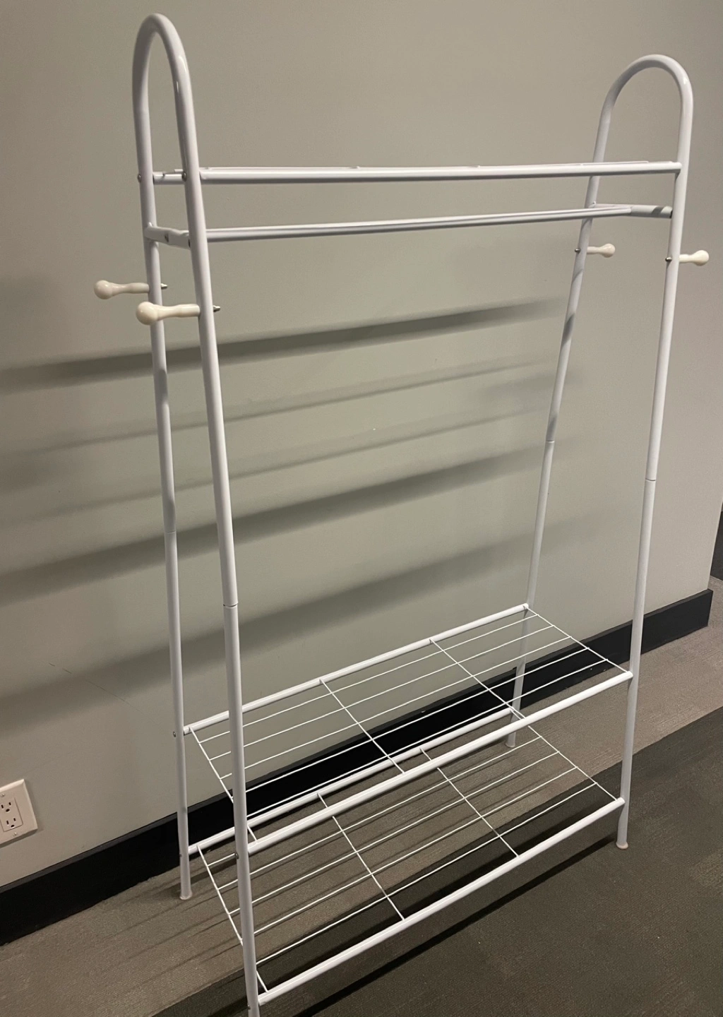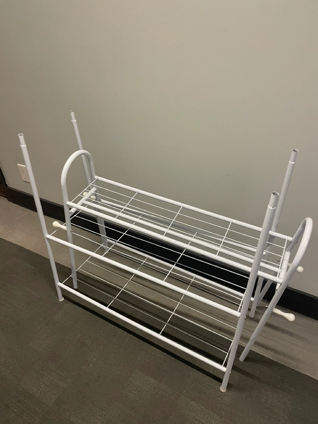 Three-tier shoe rack. Metal frame. White finish. Already assembled/ comes in 2 parts for easy transportation. Great for entryway or bedroom organization.