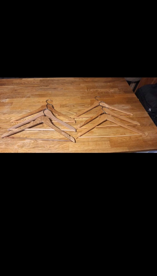 Six wooden hangers. Natural colour. Metal hooks. Great for closet organization.