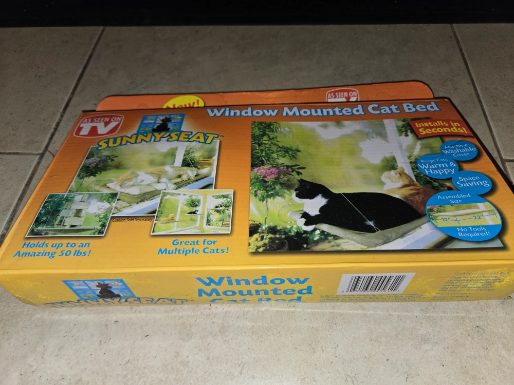 New window mounted cat bed. Holds up to 50 lbs. Machine washable cover. Great for multiple cats. Installs in seconds. Space saving. Keeps cats warm and happy. No tools required. Also have one that's open available for less $. Shoot me an offer ๐