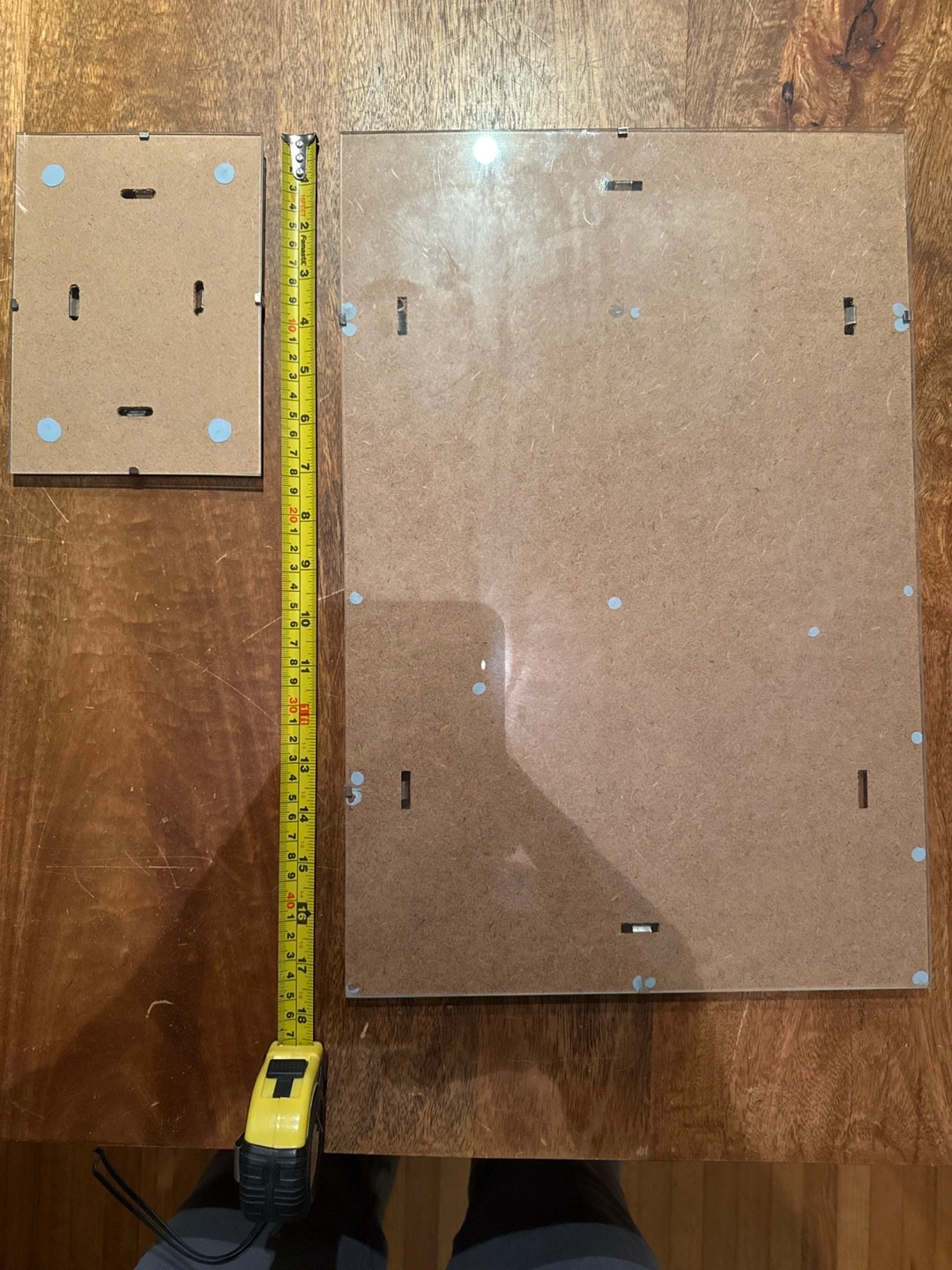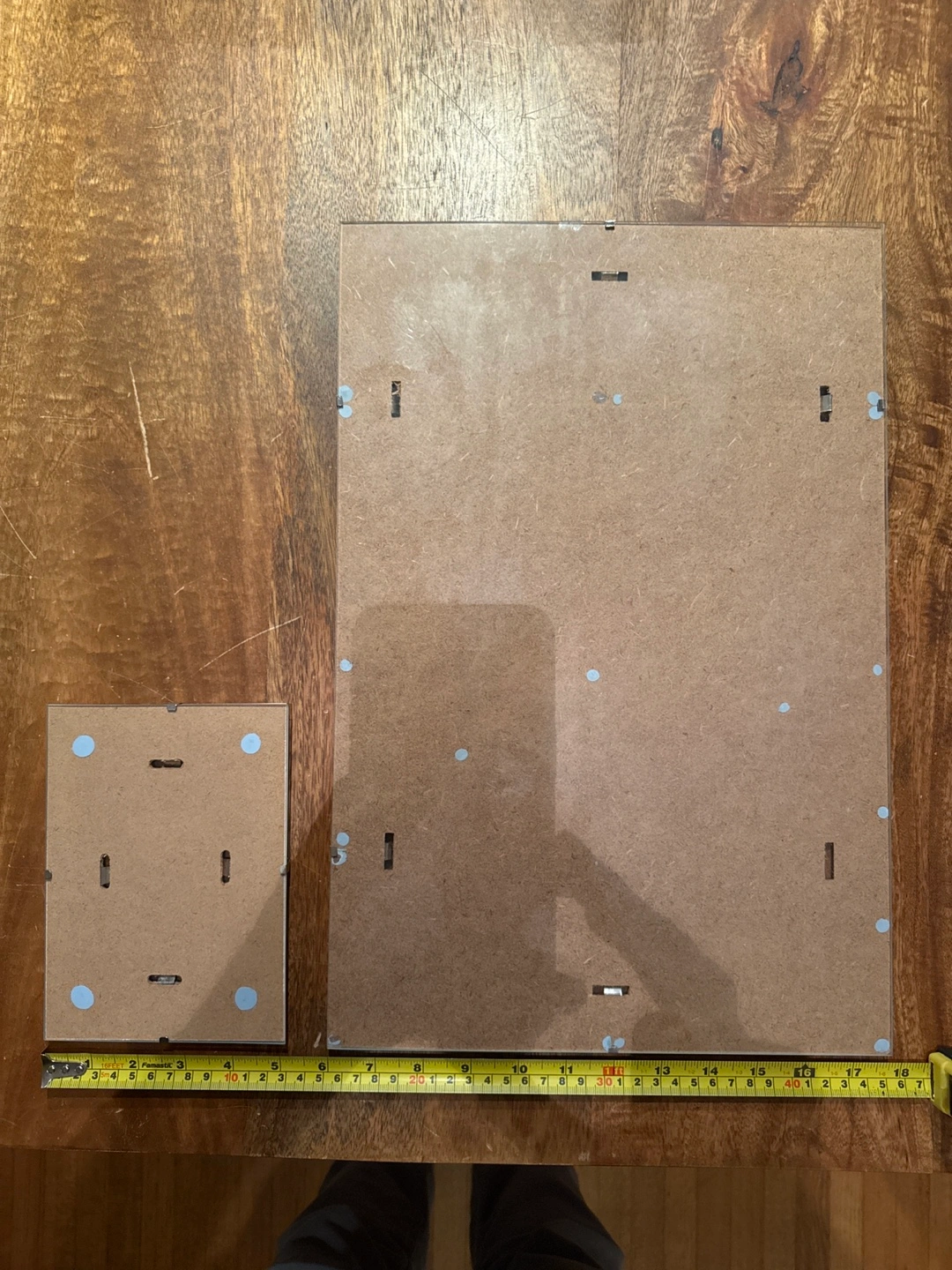 Set of two floating picture frame sets. Brown backing boards, clear glass fronts, and metal picture clips. Smaller and larger sizes available.