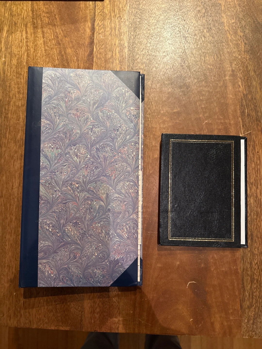 Set of two vintage photo albums. Larger album features marbled paper cover. Smaller album is black with gold trim. Both albums have plastic sleeves for photos. Great for storing memories.