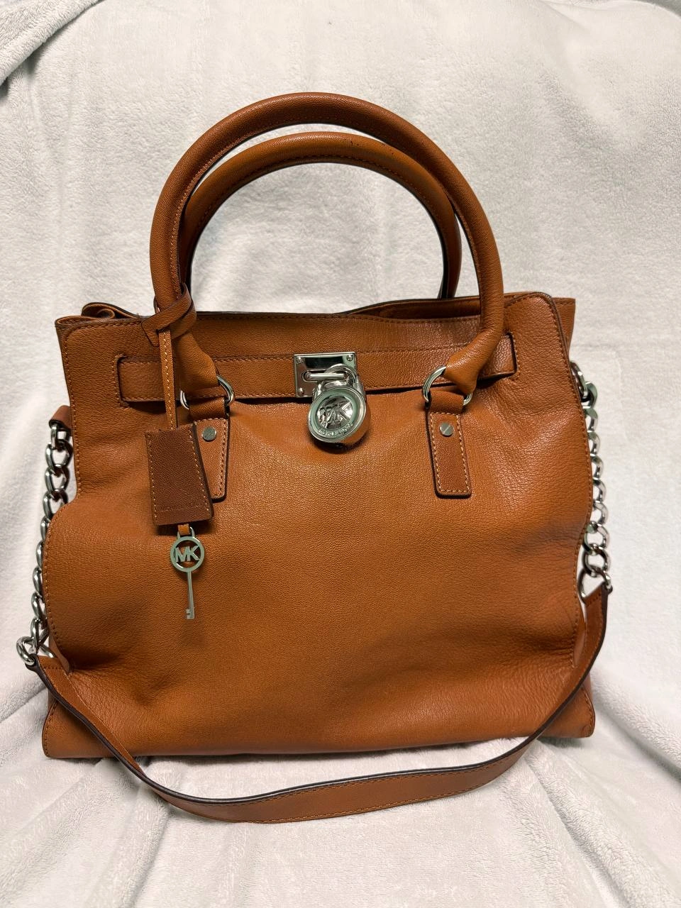 Gorgeous brown leather satchel. Features a signature Michael Kors lock closure, double top handles, and a detachable shoulder strap. Spacious interior with multiple pockets. Perfect for everyday use or special occasions.