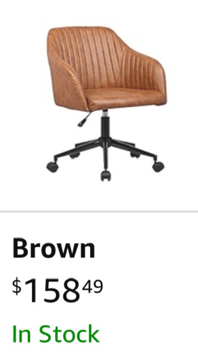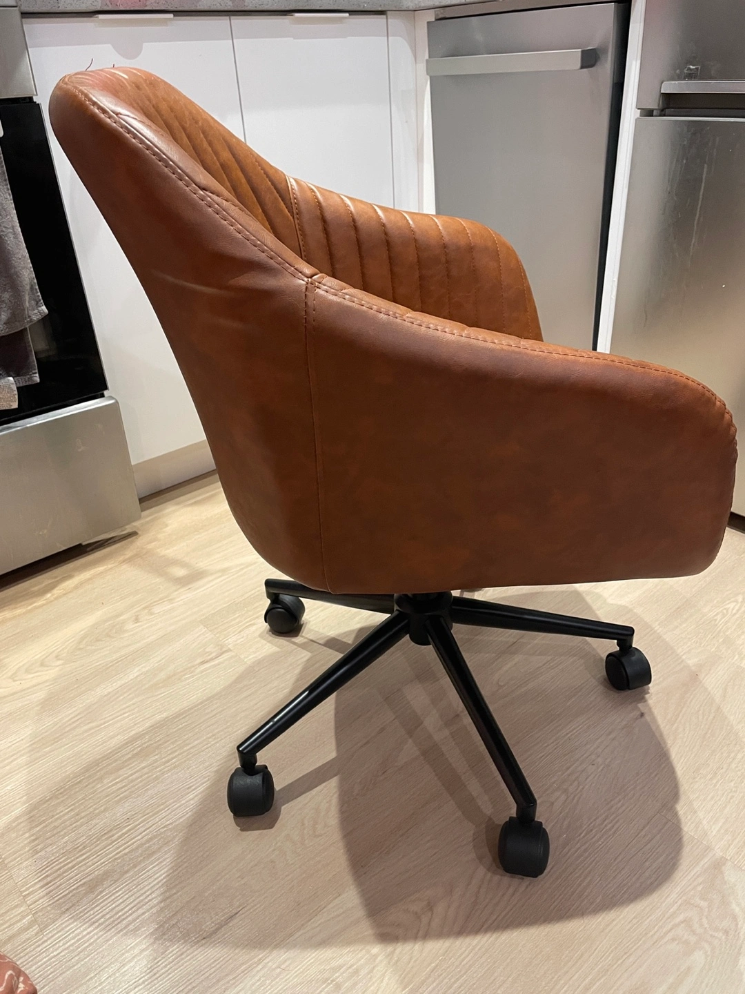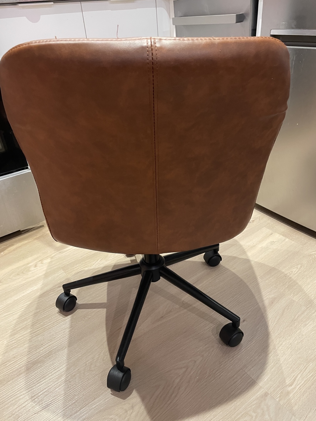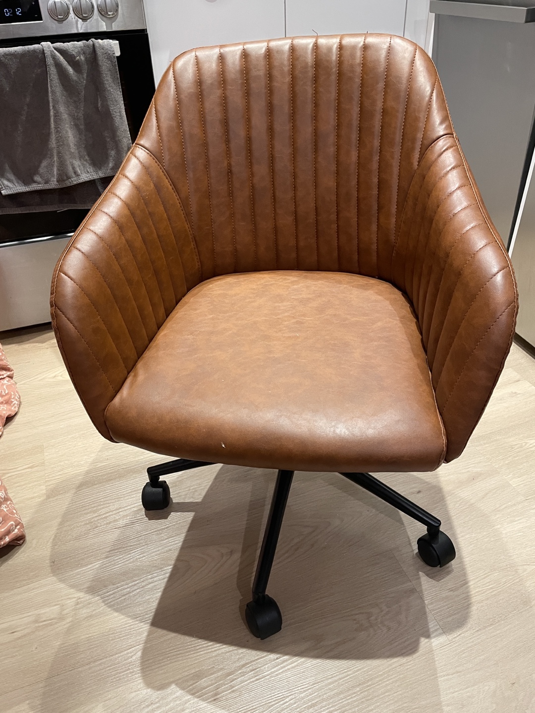 Brown faux leather office chair. Five-wheel base. Channel tufted back. Adjustable height. Modern style. First to pick up gets it! Need it gone ASAP!