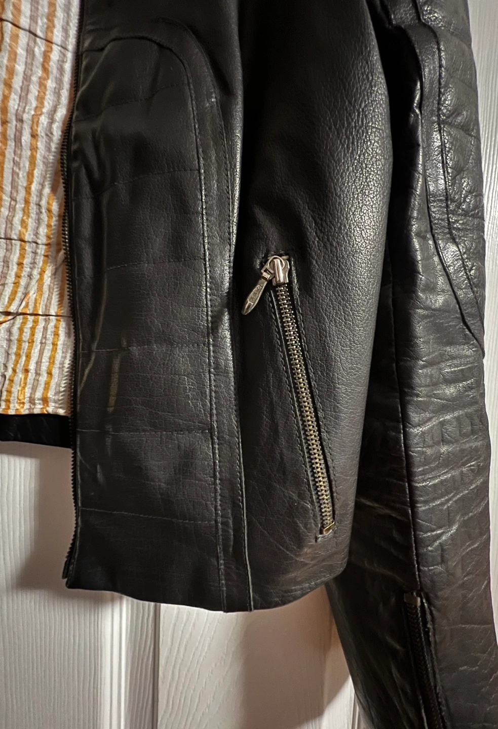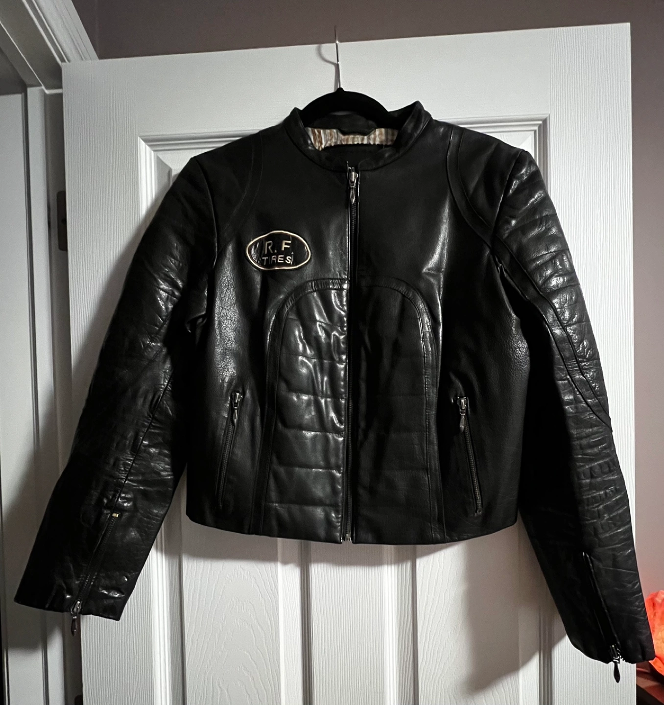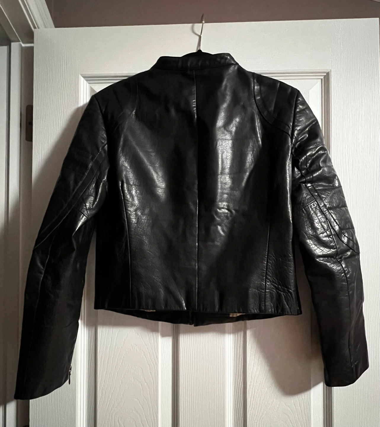 Genuine leather cropped jacket. Features a mandarin collar, zipper closure, and zippered pockets. Small logo patch on front.