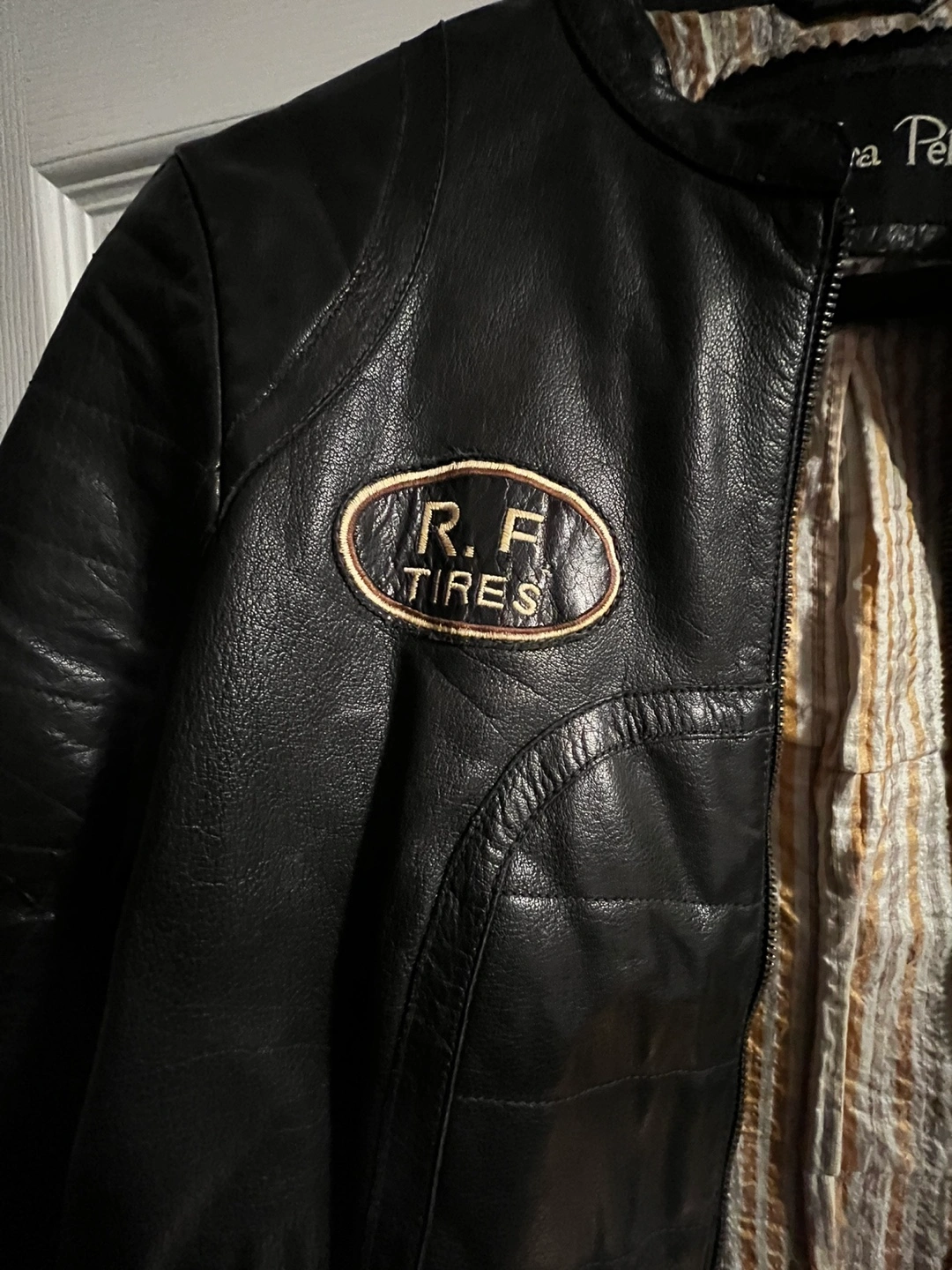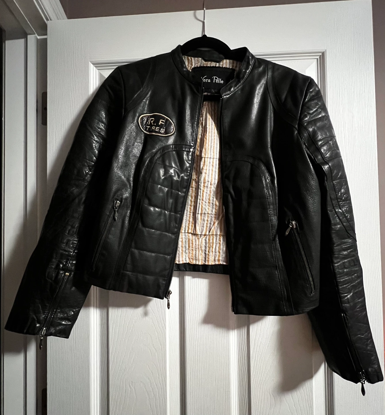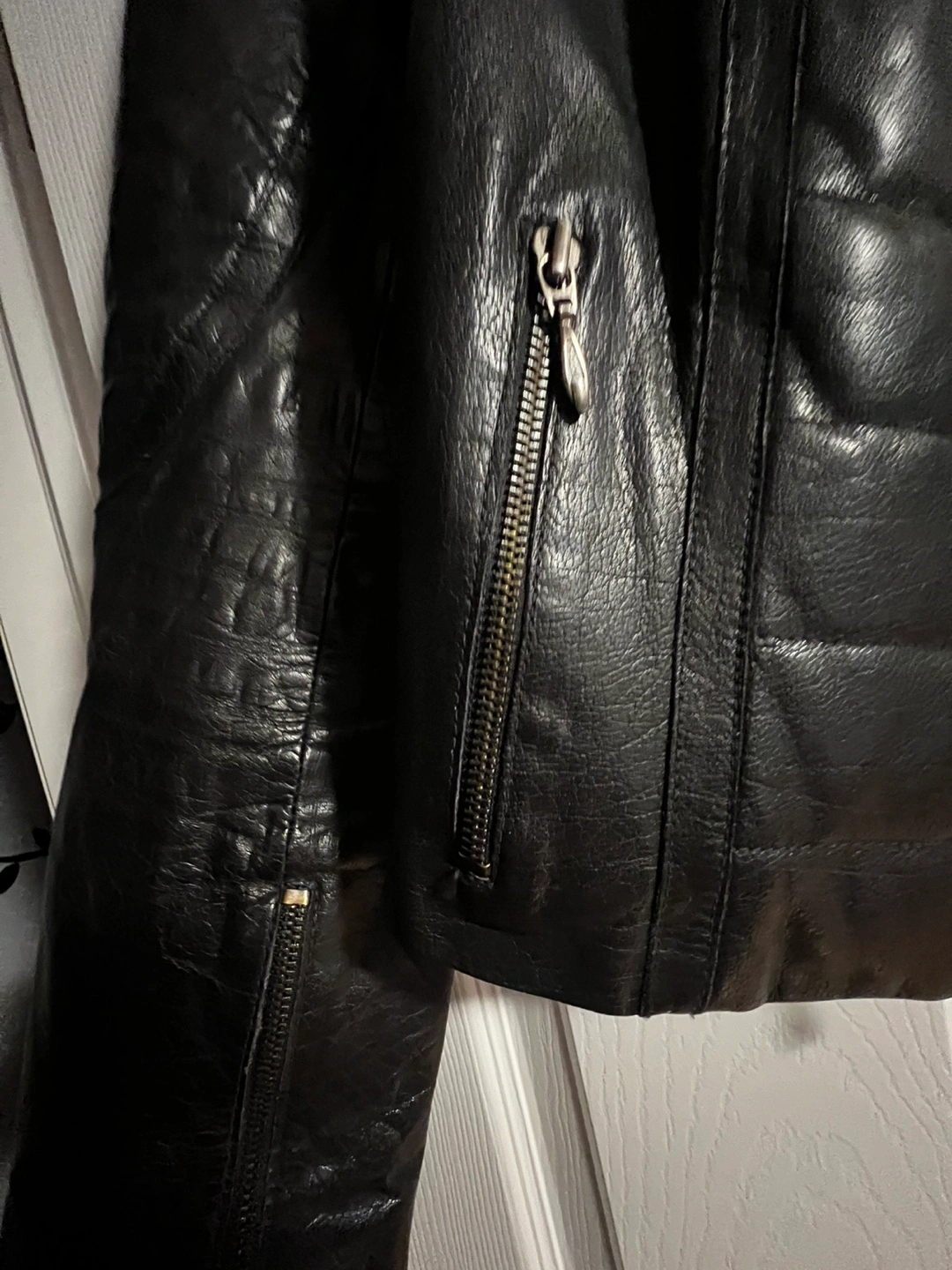 Genuine leather cropped jacket. Features a mandarin collar, zipper closure, and zippered pockets. Small logo patch on front.