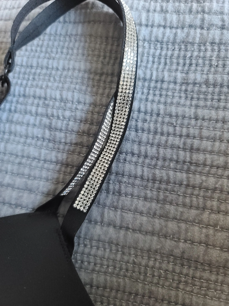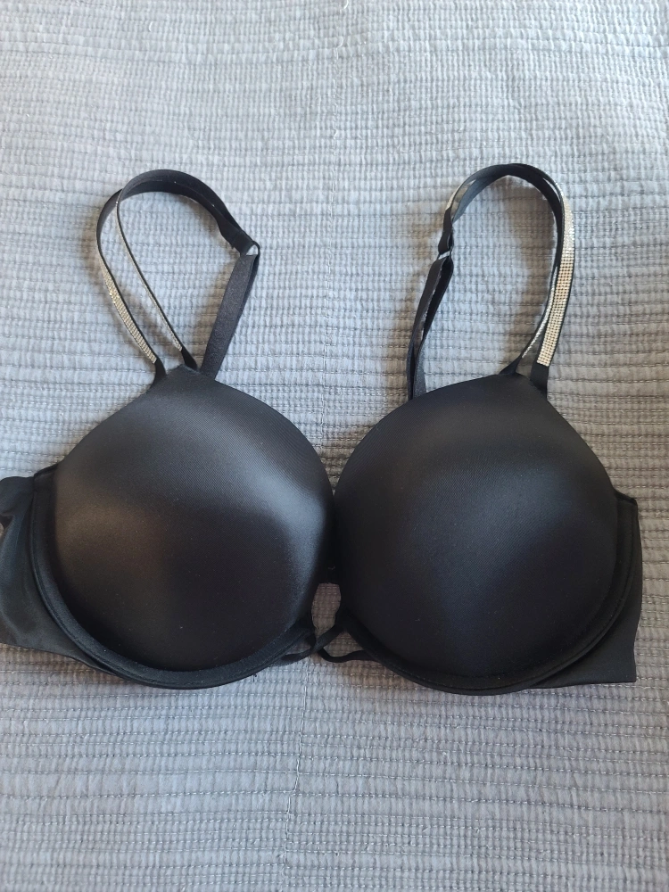 Black Victoria's Secret push-up bra in excellent condition. Features rhinestone-embellished straps. Excellent support and shaping. Size 36C.