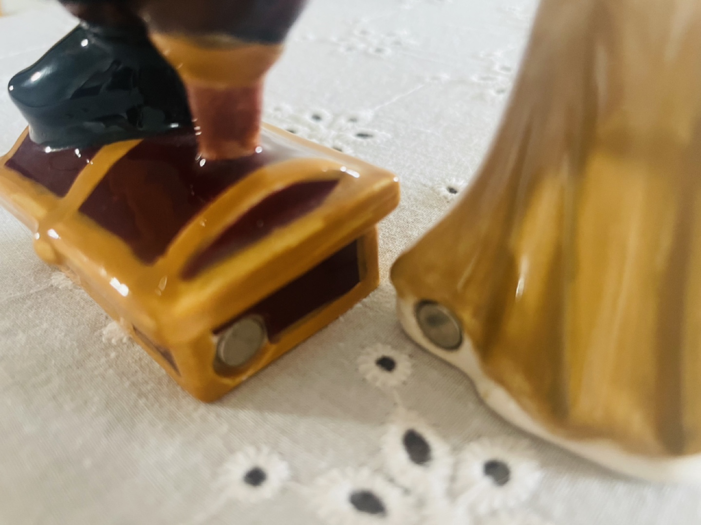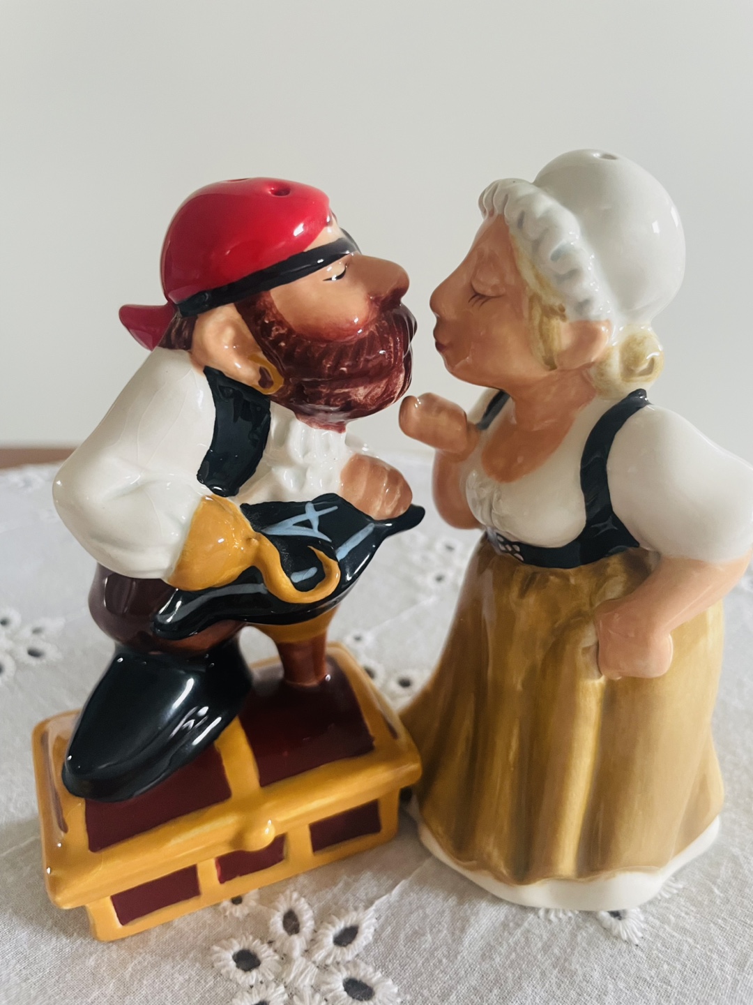 Adorable ceramic salt and pepper shakers. Features a pirate and a woman kissing. Pirate stands on a treasure chest. Hand-painted details. Unique collectible.