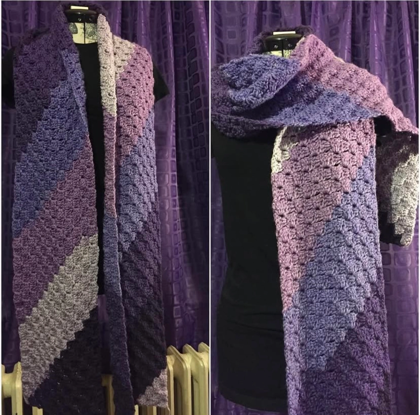 Handmade crochet long scarf Measurements Available 1, Approximately 8 in half inches wide by 64 inches long Care Hand wash. Lay flat to dry 80% Acrylic/ 20% Wool All items are made by me in my smoke free home Price $40 Cash Payment Only No Refunds / Exchange No try ons, No trading No holds. All purchases are Finally Sale From a Smoke Free home First come, First Serve Fast pick up Confirmed Price-$40 Pick up- at TTC Station- Coxwell subway station Located In East York, Toronto See more creations @violetuniquecollection On Facebook or Instagram Thank you for supporting a small business and shopping handmade!