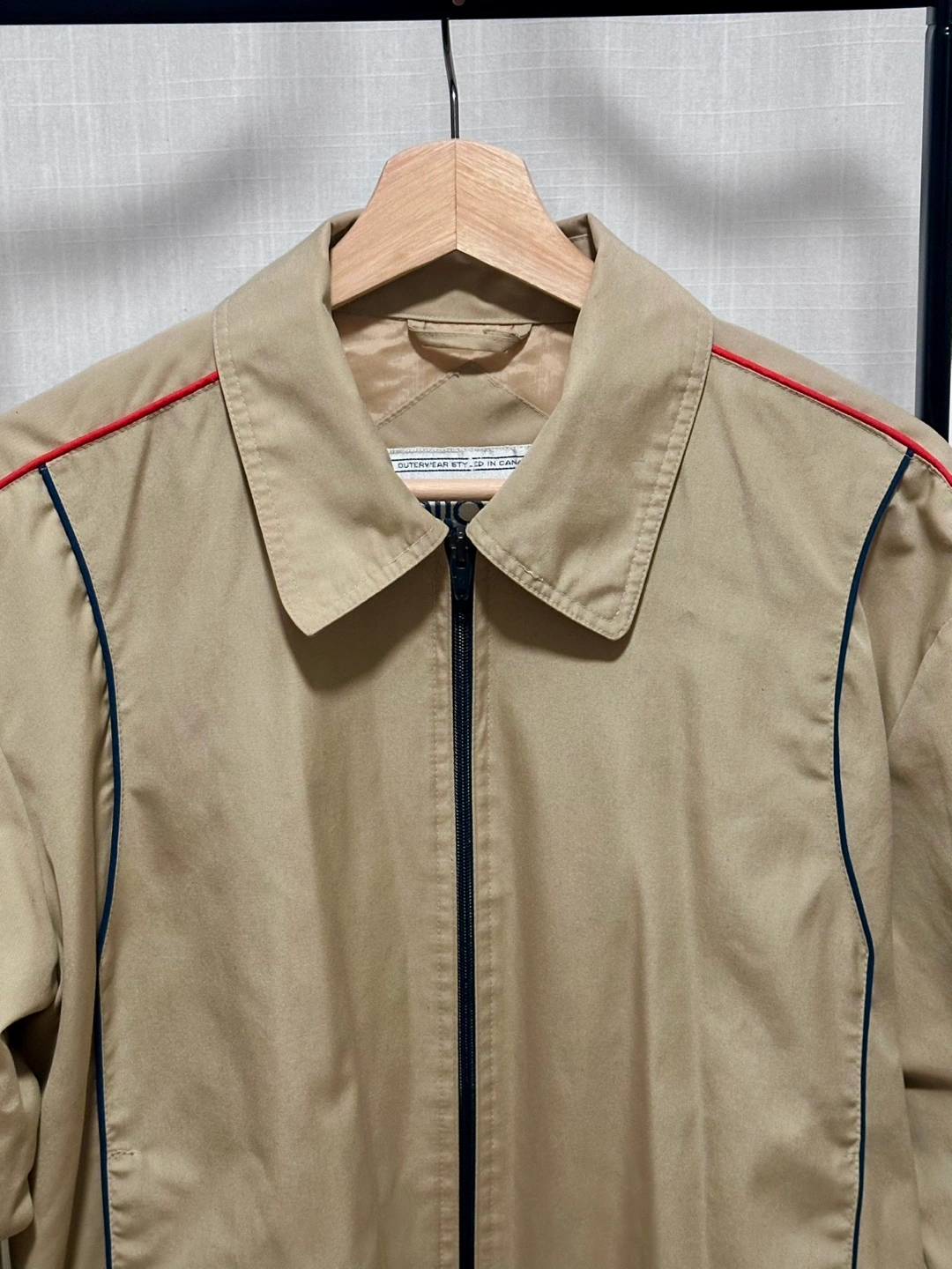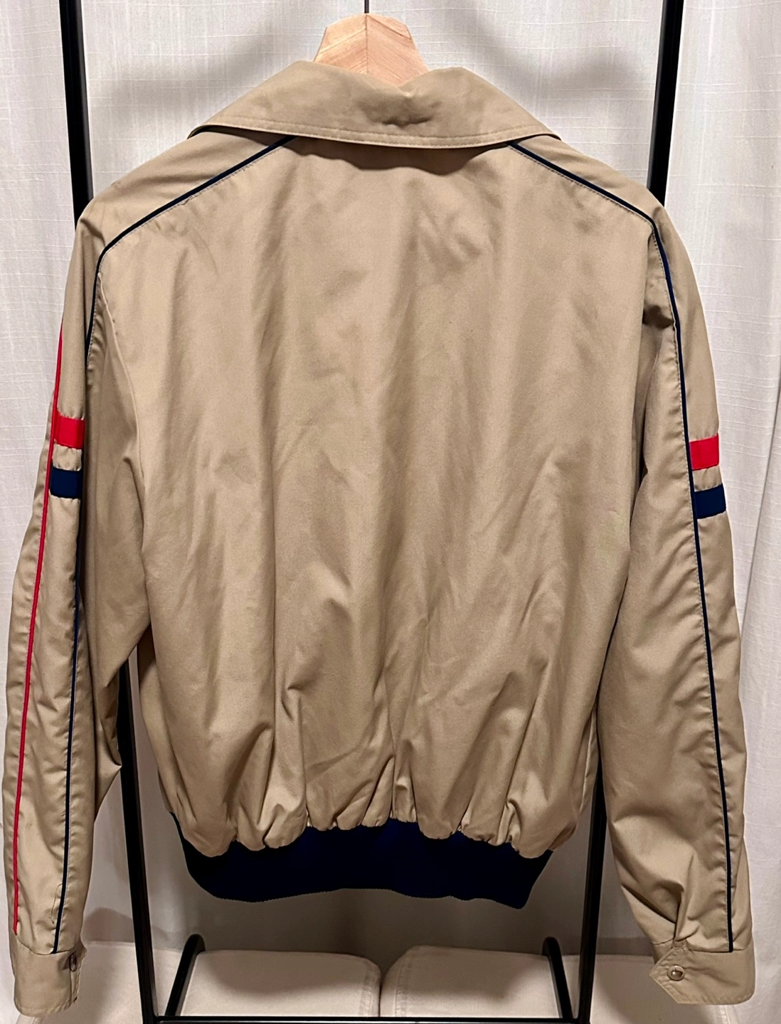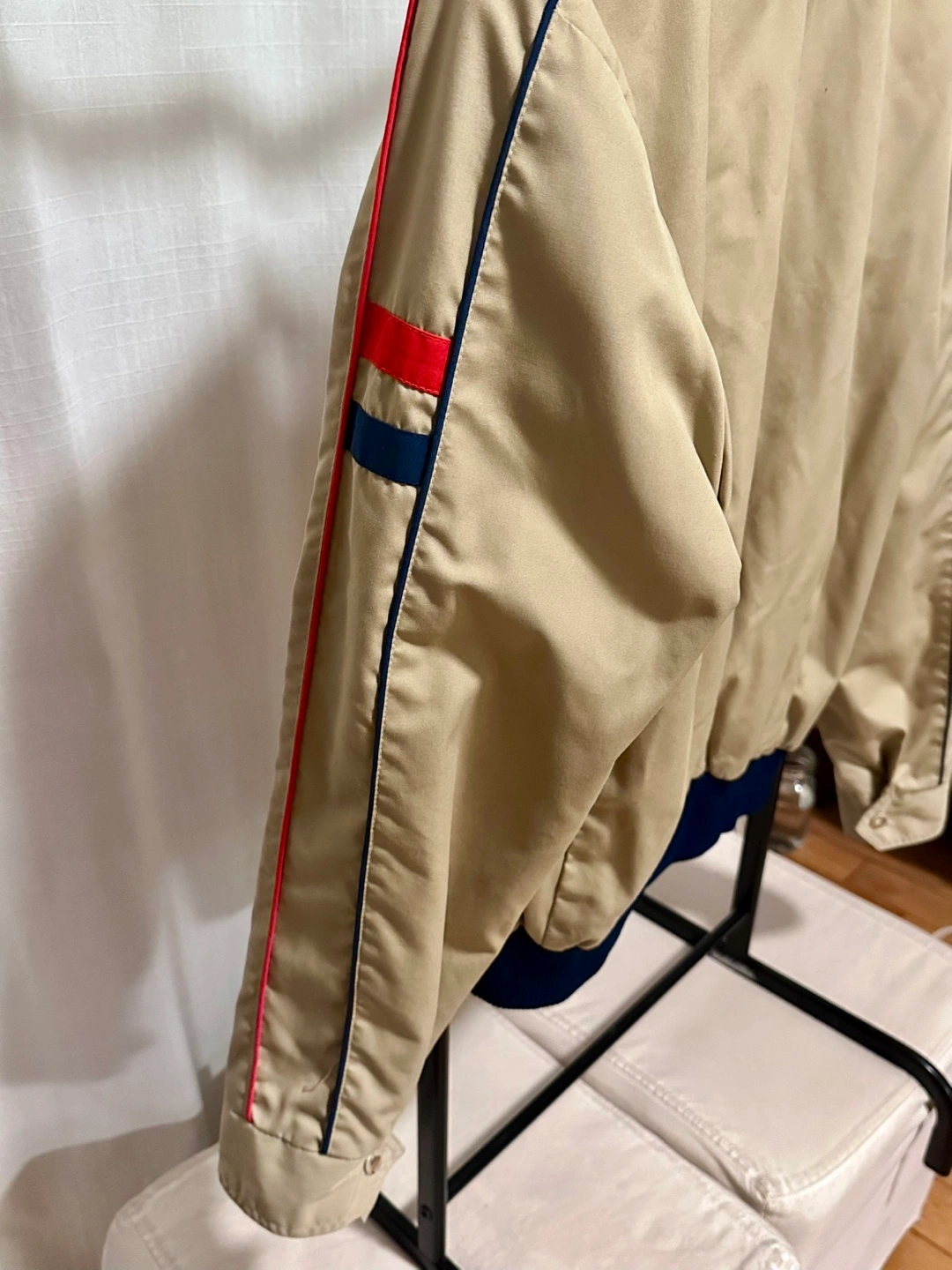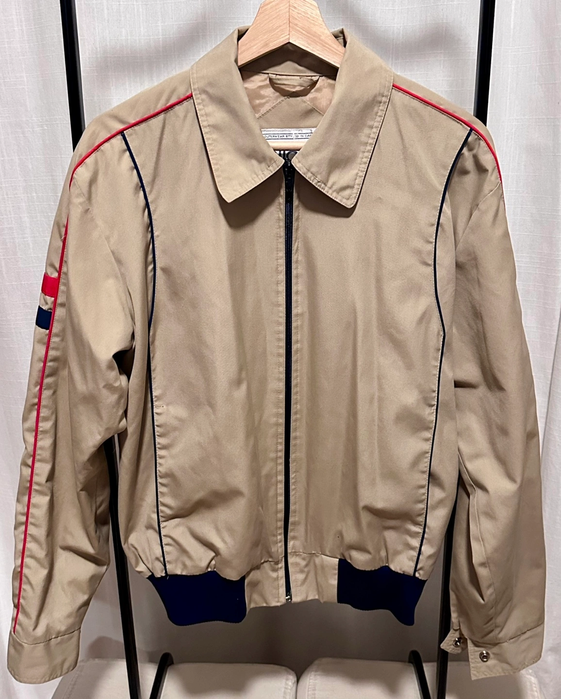 Vintage Beige Tan Jacket with Red and Blue Stripe accents on sleeves, featuring a zipper front and a collar jacket. Ribbed cuffs and hem. Side pockets.