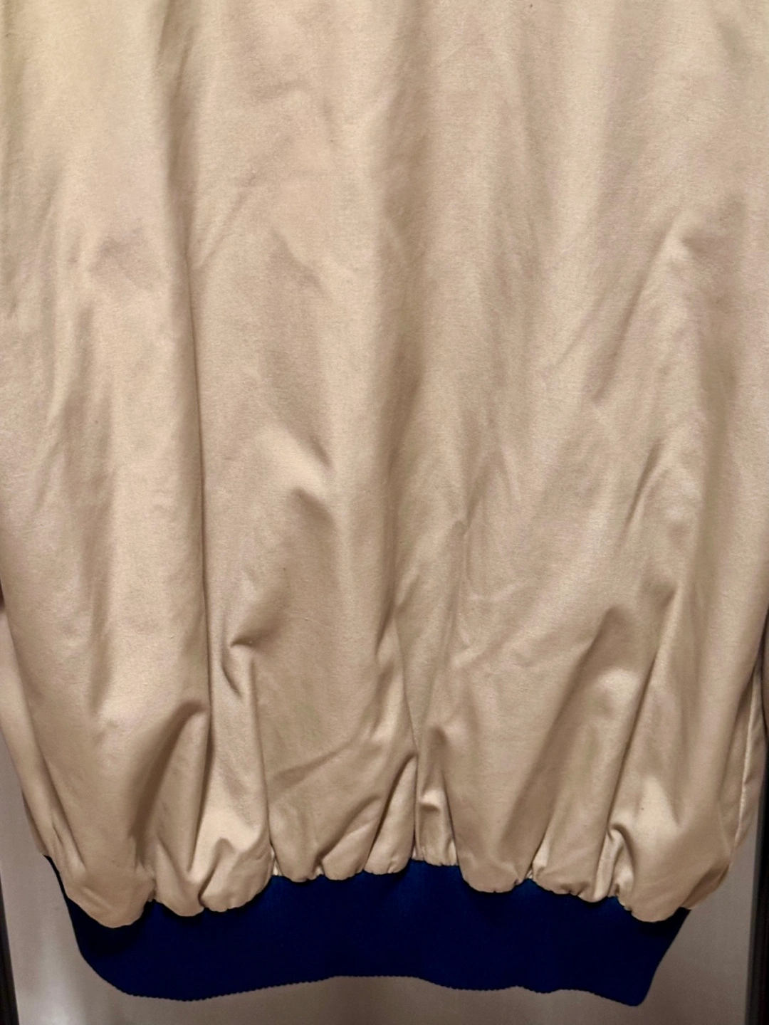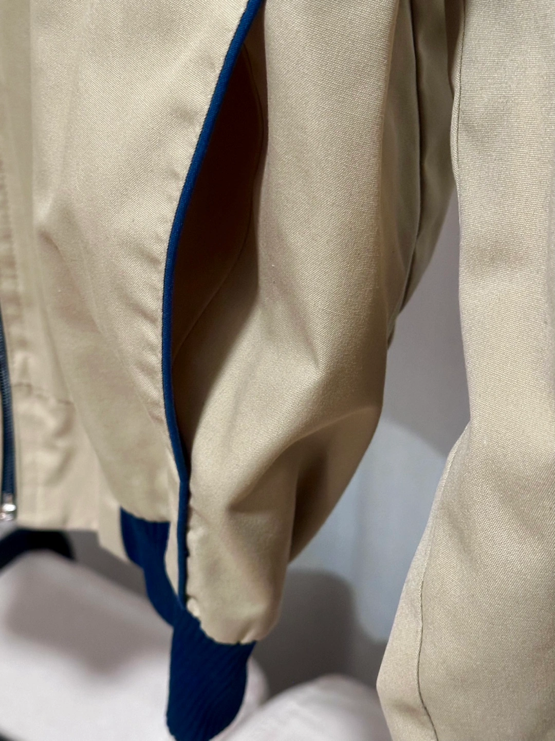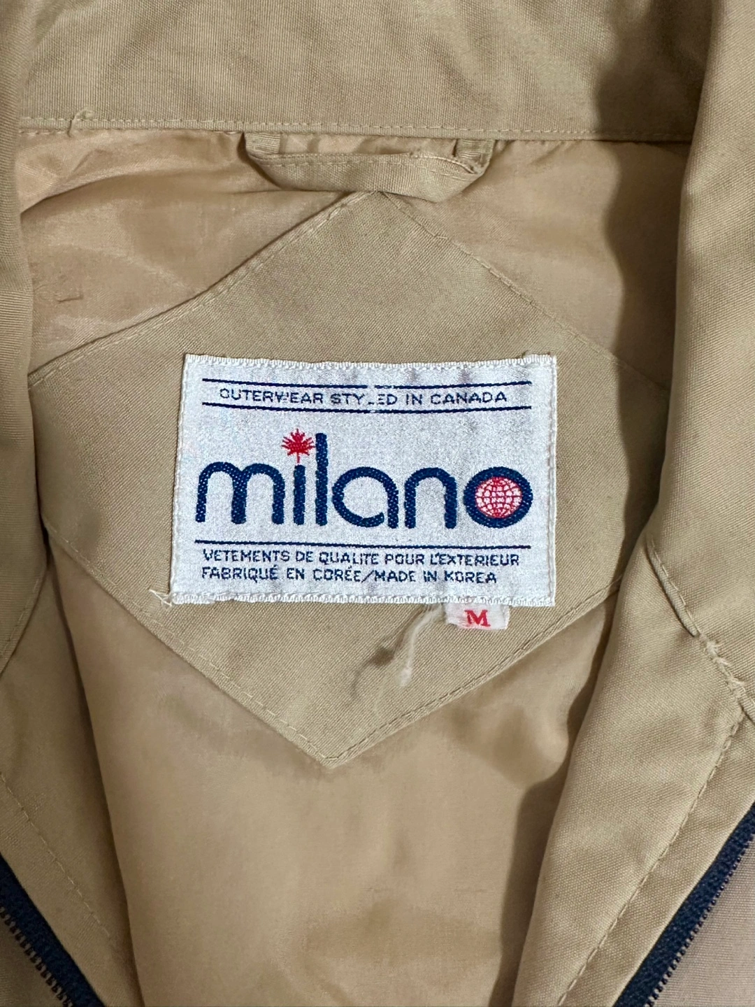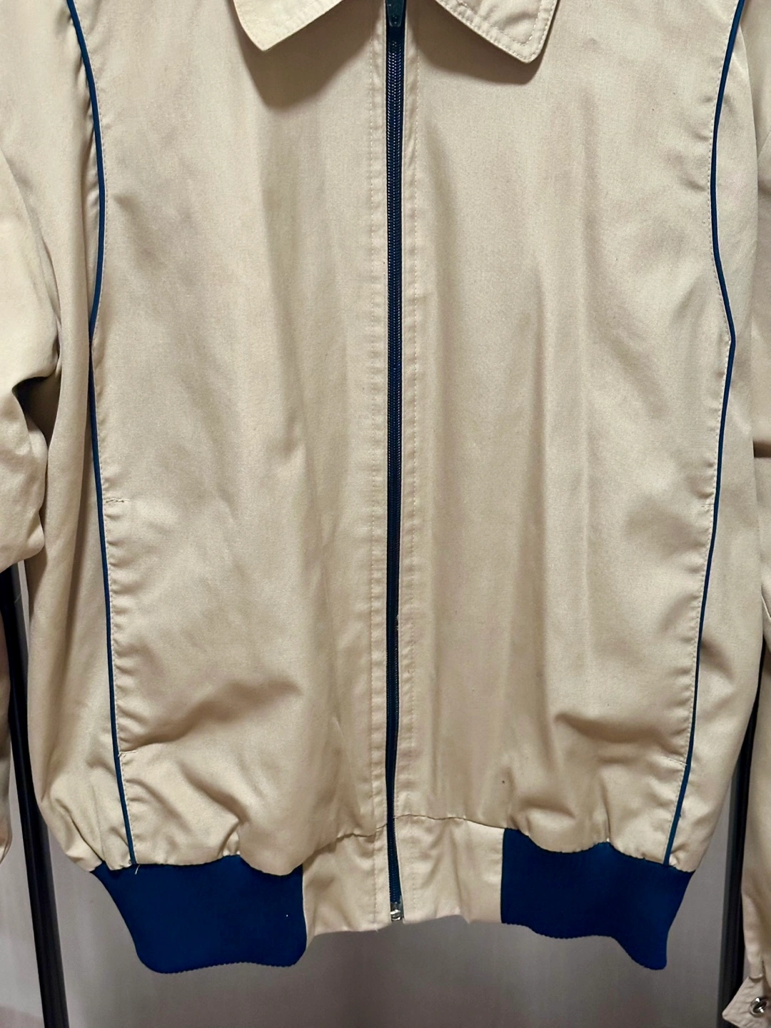 Vintage Beige Tan Jacket with Red and Blue Stripe accents on sleeves, featuring a zipper front and a collar jacket. Ribbed cuffs and hem. Side pockets.