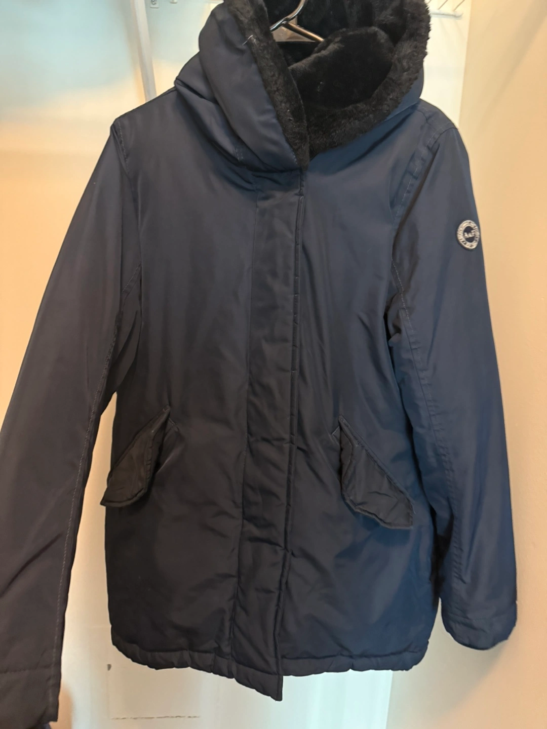 Women's dark navy parka. Features a faux fur lined hood, zipper closure, and pockets. Long sleeves. Great for colder weather. Machine washable