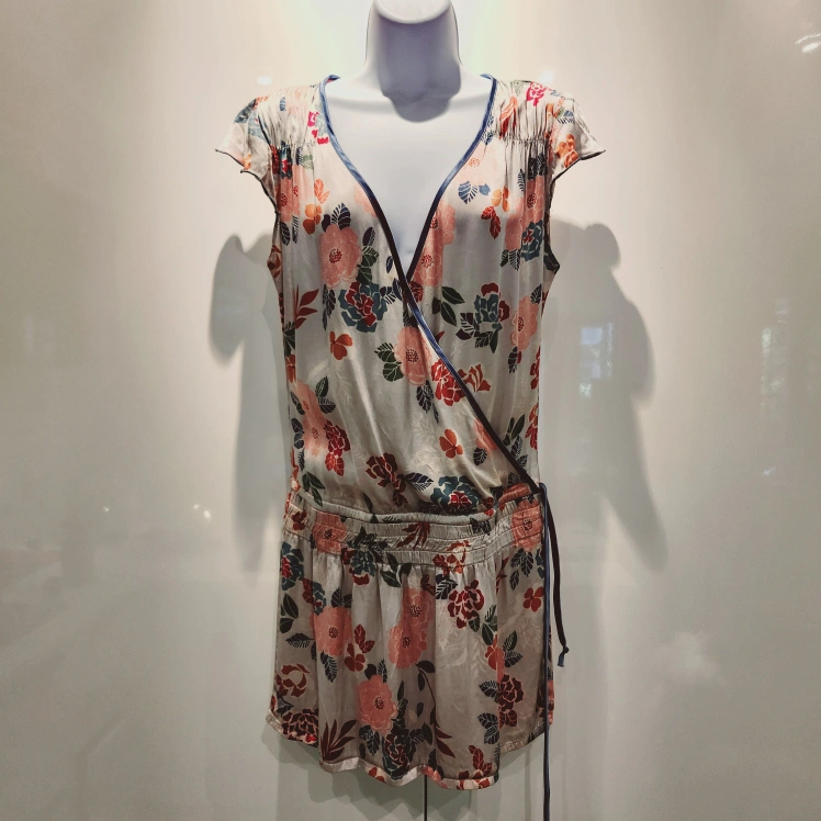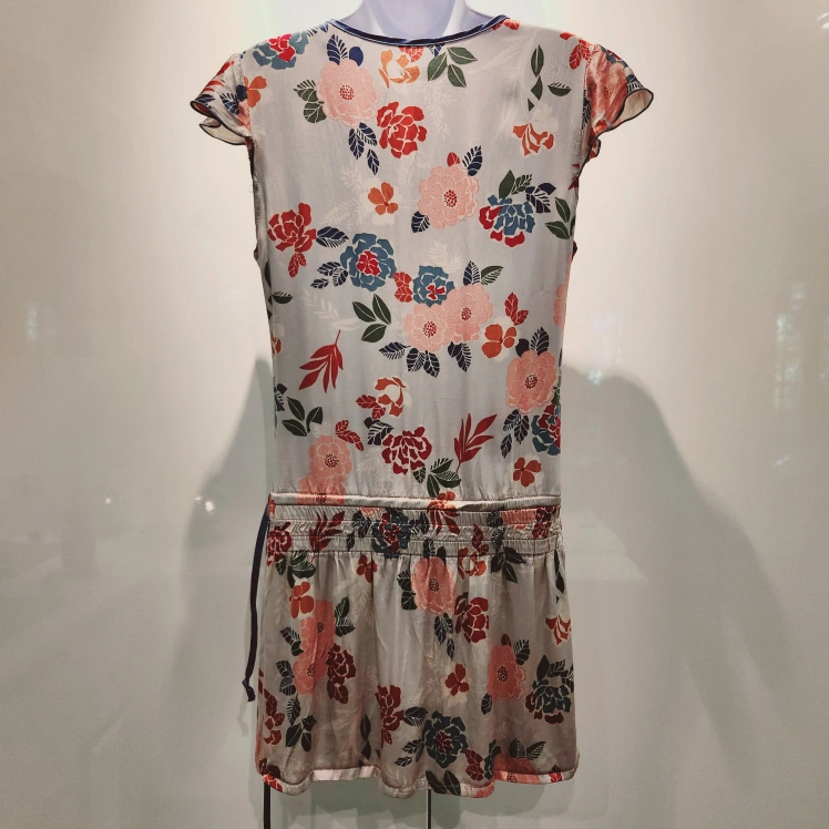 Beautiful floral print mini dress. Features a "wrap" style, short cap sleeves, and a cinched waist. Light, flowy soft silky like fabric. Perfect for summer.