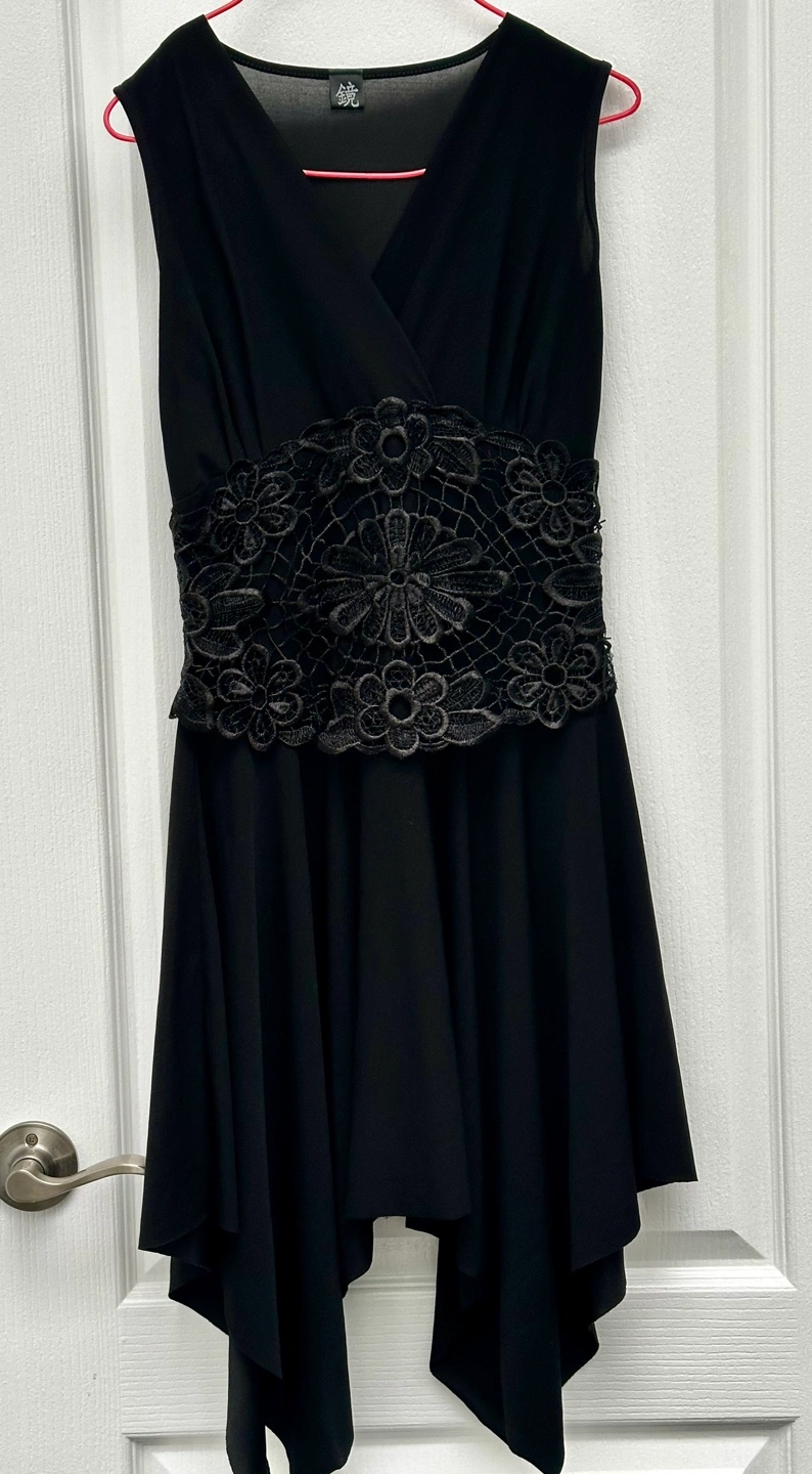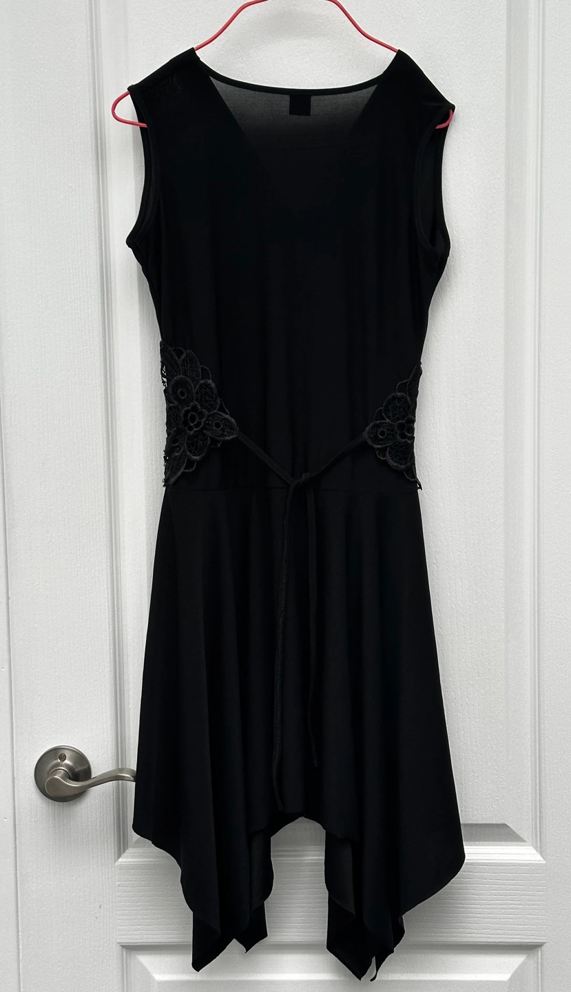 Elegant black dress. Crossover front, featuring a V-neckline, sleeveless design, and intricate lace detailing around the waist. Asymmetrical hemline. Back tie closure.