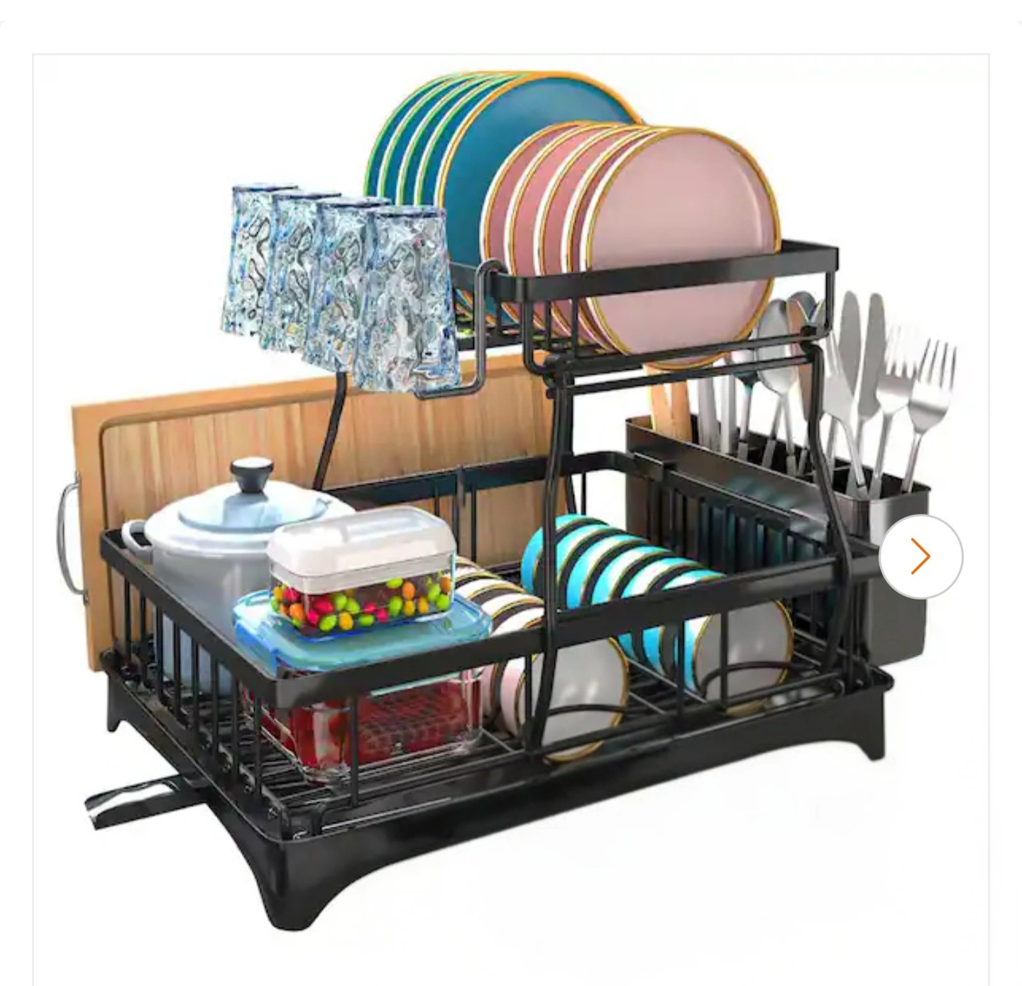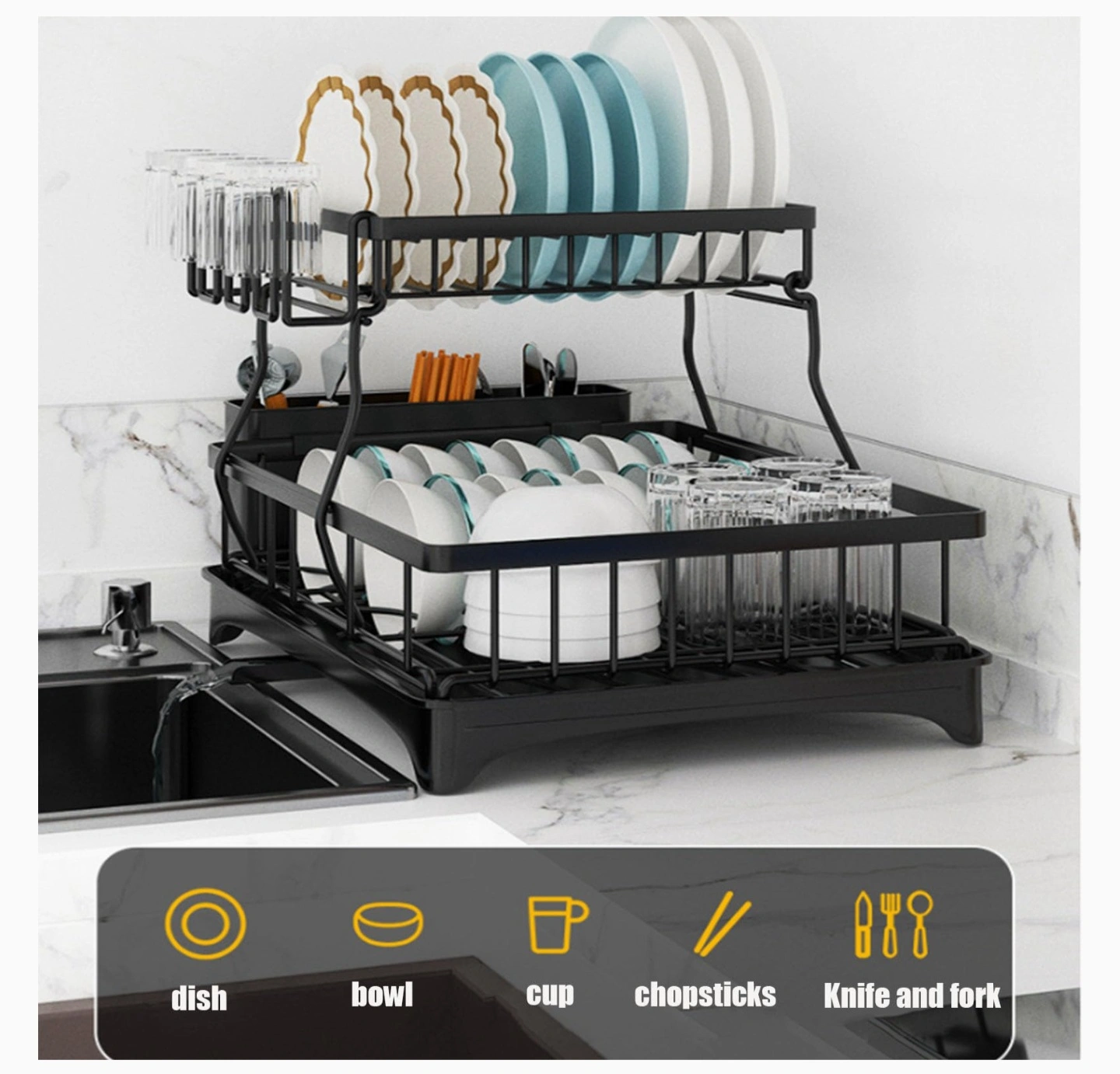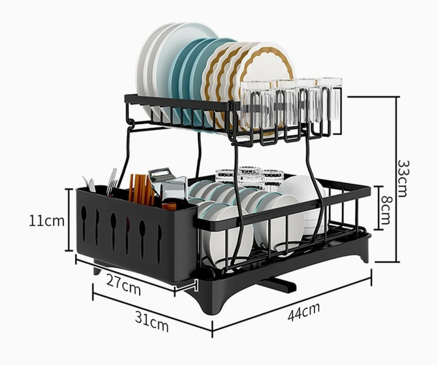 Brand New Spacious two-tier dish rack. Holds plates, bowls, cups, and cutlery. Durable metal construction. Black finish. Easy to assemble and clean. Pick up at Yonge & Steeles