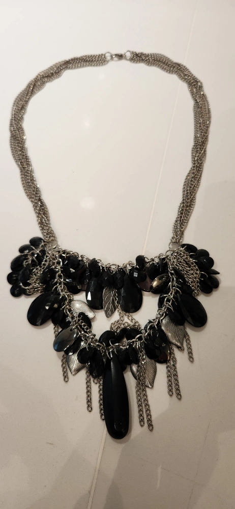 Layered chain necklace. Features black stones and silver accents. Multiple chains and dangling charms. Eye-catching statement piece.