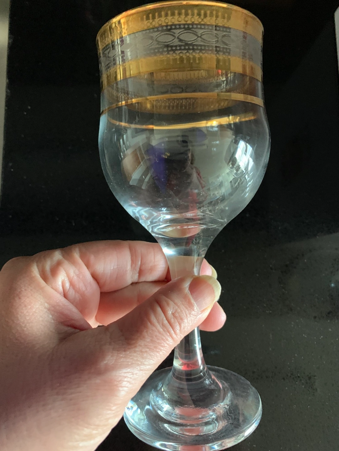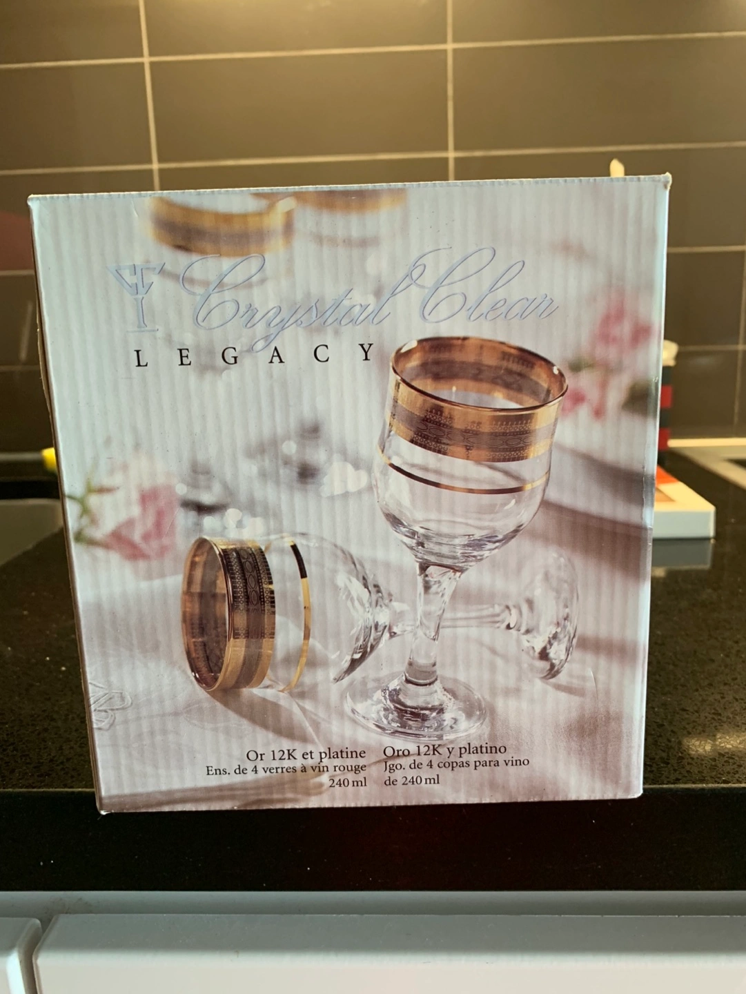 4 in package elegant wine glasses. Gold detailing. Part of the Crystal Clear Legacy collection. 240ml capacity. In original box.