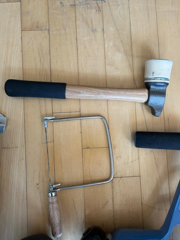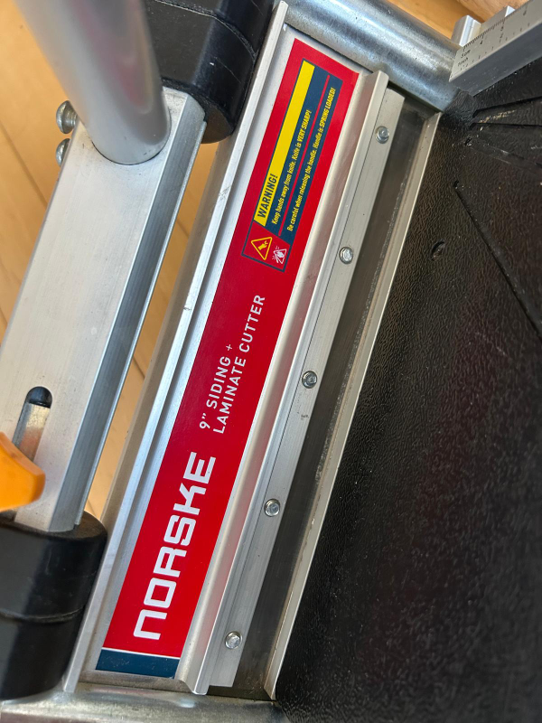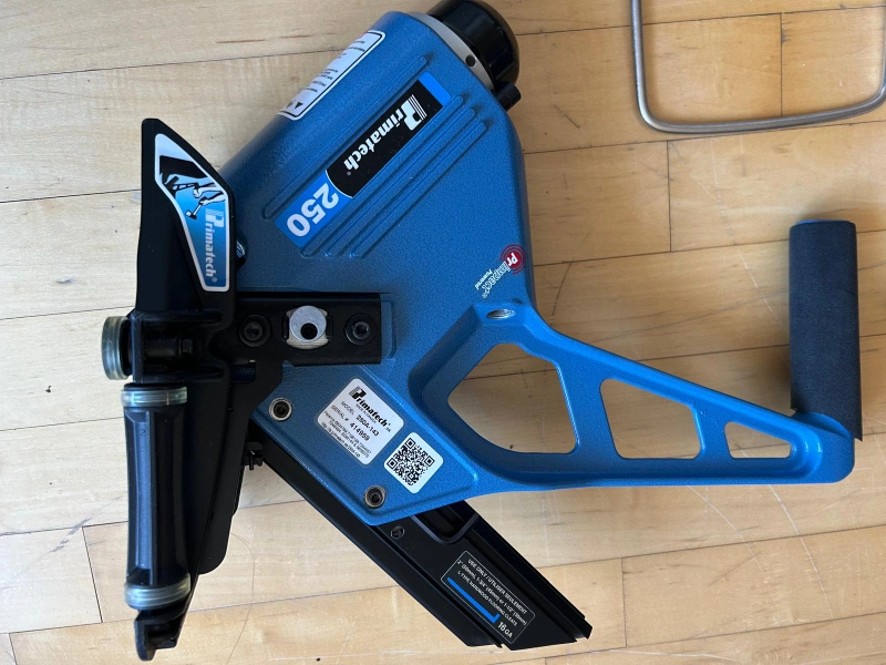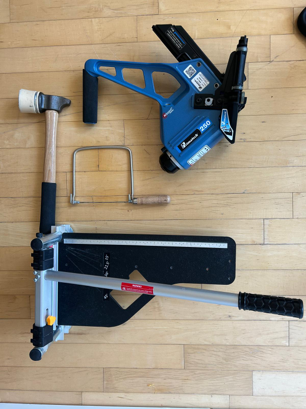Complete floor installation kit. Includes a 9" Norske siding and laminate cutter, a blue FinniTech 250 nail gun, a coping saw, and a mallet. Great for DIY projects or professionals.