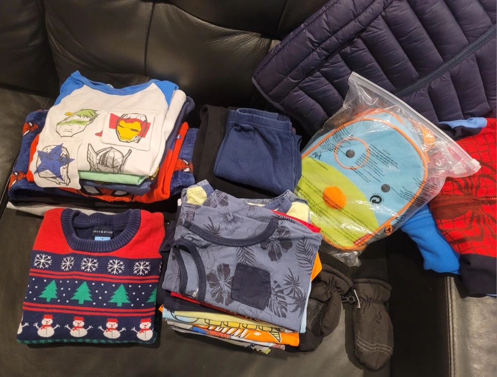 4T Large bundle of boys' clothing. Includes several graphic tees, a Christmas sweater, pants, wind proof puffer jacket, a pair of waterproof mittens and a backpack.