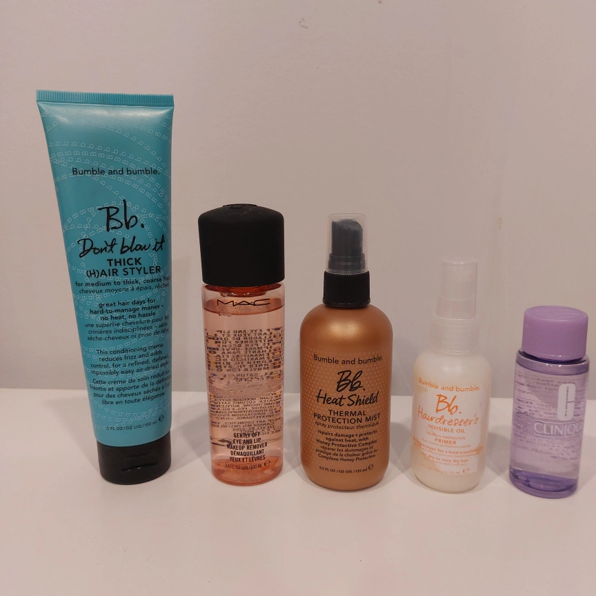Bundle includes three Bumble and bumble. hair styling products: Don't Blow It Thick Hair Styler, Heat Shield Thermal Protection Mist, and Hairdresser's Invisible Oil Primer. Also includes a MAC Cosmetics Gentle Eye and Lip Makeup Remover. Never used.